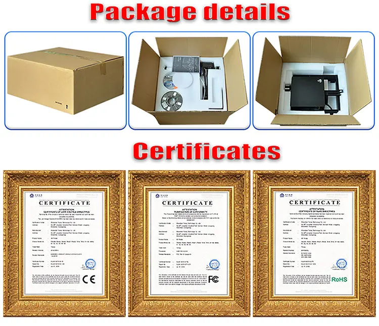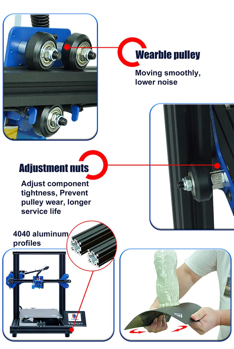 Особенности:Алюминиевая рама профиля, которая имеет сильную структуру и высокую стабильность.С 3,5 дюймов Полноцветный сенсорный экран, легко понять и работать.Принтер имеет функцию повторной печати, когда мощность восстановлена, принтер будет продолжать печатать с точки прерывания.Поддержка обнаружения филамента, своевременное напоминание о нехватке нити или ее отключении.Высококачественный Автоматический Датчик выравнивания, обеспечивает выравнивание горячей кровати, Улучшает точность печати.Головка экструдера с двойными вентиляторами, улучшенный охлаждающий эффект, более стабильная печать, более длительный срок службы.Прочная черная наклейка, легче снять модель и не бояться царапать поверхность.Max.255 * 255*260(245) мм размер печати, поддержка различных 1,75 мм печати, такими как PLA ударопрочный полистирол сверхвысокой ударной прочности HIPS, дерево, ПК, ПВХ и многое другое.Широко используется в игрушечных, архитектурных, мебельных, образовательных, медицинских, повседневных и других областях.Характеристики:Структура: алюминиевый профильПоддержка печати: tf-карта/USBТочность позиционирования оси XY: 0,0125 ммТочность позиционирования оси Z: 0,02 ммПодключение (интерфейс): USB, ЖК-дисплей и устройство для чтения sd-картРазмер машины: 47,8*45,5*52,0 см/18,81*17,9*20,5 дюймаМашина Вес: 8,5 кг/18.7lbsРазмер посылка: 52,0*49,0*25,0 см/20,5*19,3*9,8 дюймовПосылка, вес: 12 кгПосылка:1 * набор 3D-принтеров1 рулон 250 г PLA нити
