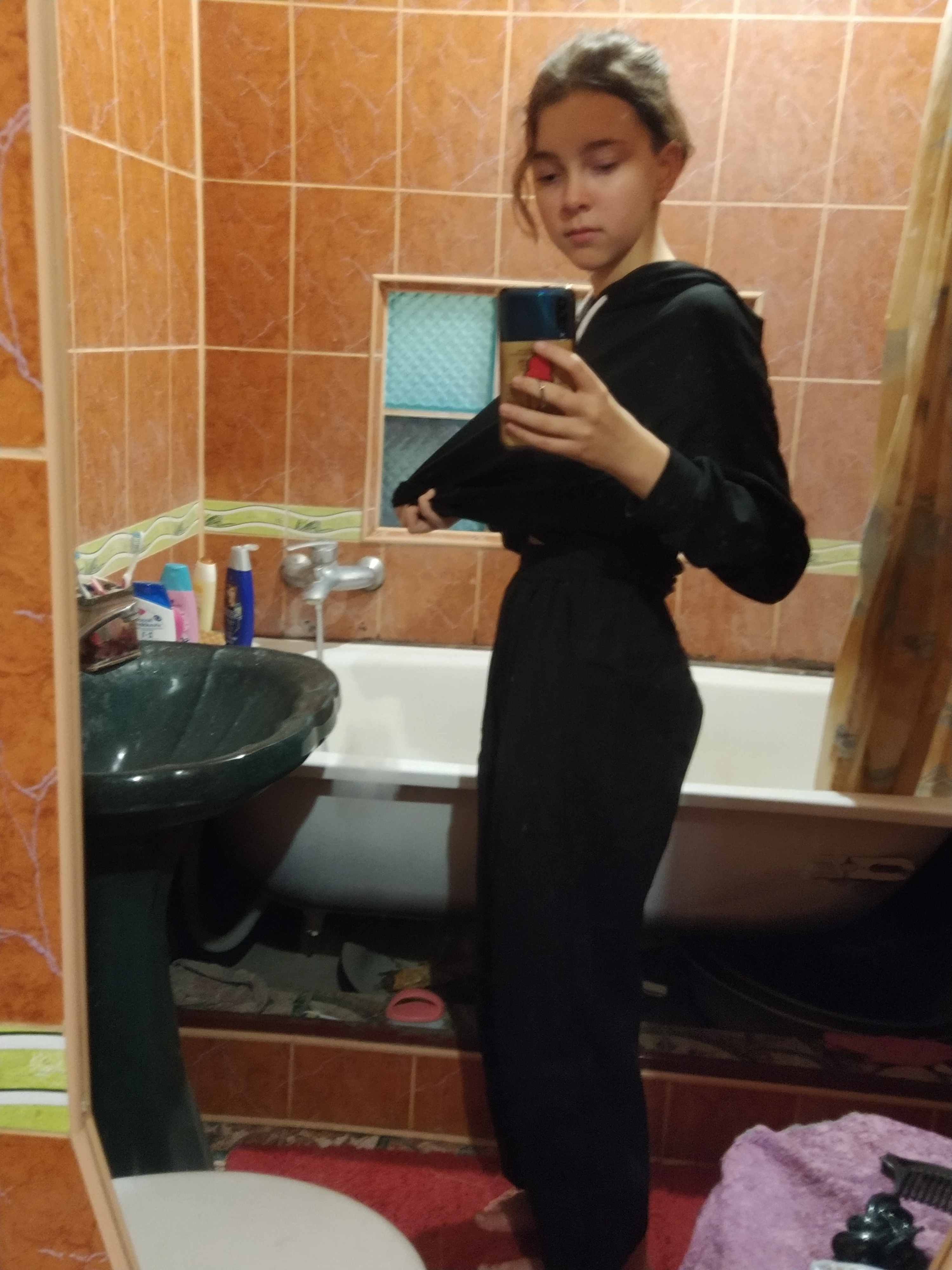 Цвет намного легче, чем на картинке, качество ткани не удивительно. Верхняя часть и брюки очень узкие. Может быть, они выглядят лучше на картинке, потому что девочка намного тоньше/меньше? Im 160 см и 52 кг так не очень пухленькие:/ dunno im going yo попробуйте потемнить их сам snd tryto fix их