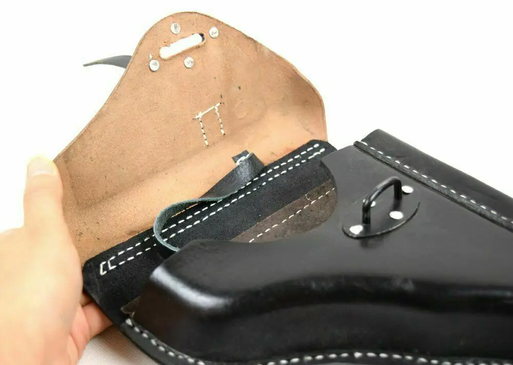 Кобура в целом хорошая, снаружи вообще без проблем. Видимо, долго хранилась на складе, на внутренней части застёжки чуть заржавело по краю и черная краска потрескалась (кракелюры). На функции не влияет, да и исправляется при желании несложно. Еще один момент - одна из внутренних заклепок застёжки плохо зажата, торчит и может поцарапать пистолет - сначала лучше осмотреть. Тоже можно обточить или заклеить чем-то сверху. Ну и поскольку кобура жесткая (как и указано), неплохо бы сначала растянуть, а то пистолет туго заходит и выходит.