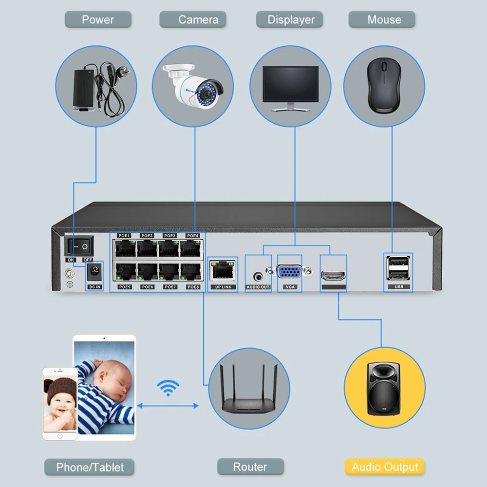 Сетевой видеорегистратор H.265, 8 каналов, 4K, 5 МП, 4 МП, 1080P, NVR, аудиовыход, сетевой видеорегистратор до 16 каналов для камеры POE, система видеонаблюдения