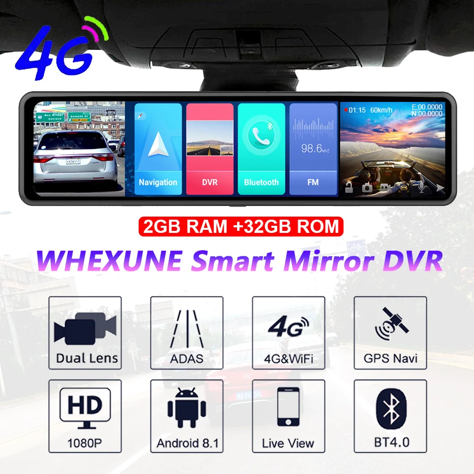 Видеорегистратор-зеркало заднего вида WHEXUNE, 12 дюймов, 2K, 4G, Android, ADAS