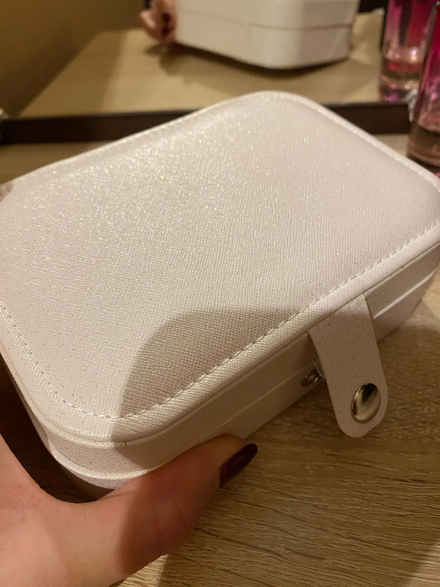 На фото продавца не видно, но бежевая шкатулка покрыта пошлыми крупными блёстками. если заказываете в подарок, учитывайте это