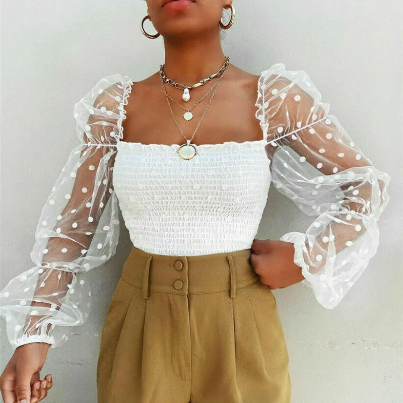 Футболка женская в горошек, эластичная, прозрачная, с длинными рукавами, облегающая, на бретелях, осенняя, пикантные сетчатые Топы