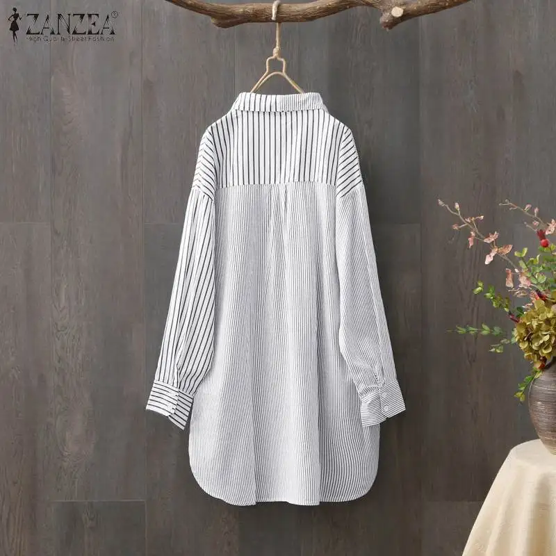 Модные рубашки с асимметричным подолом ZANZEA, Женская полосатая блузка с длинным рукавом, весенние Лоскутные блузы, женские офисные топы, Женская сорочка
