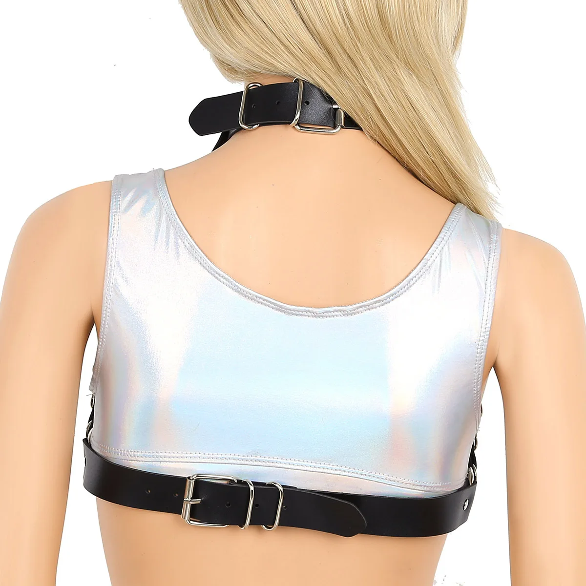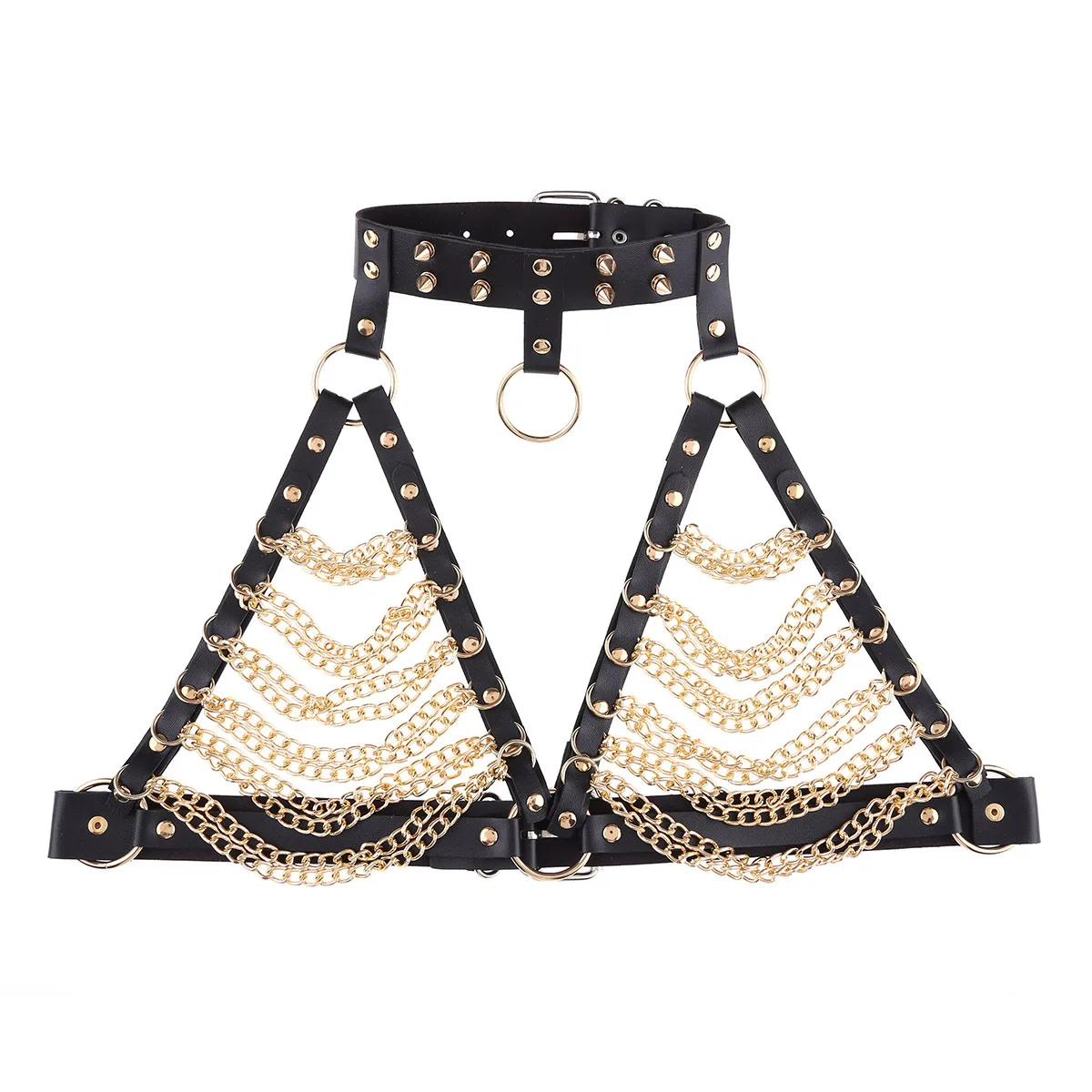 Готический кожаный укороченный топ ручной работы для женщин, в стиле панк, с металлическими цепочками, с заклепками, с воротником через шею, топы, регулируемый танцевальный фестиваль, одежда для Хэллоуина