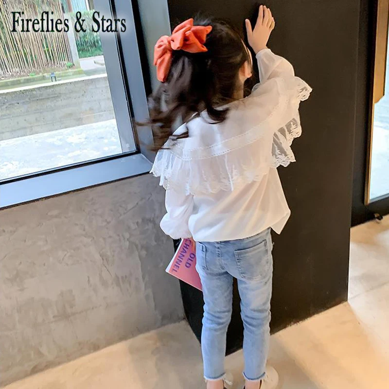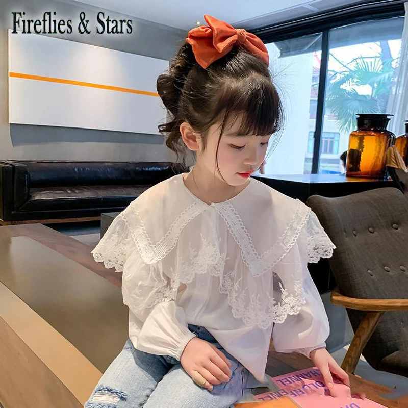 Имя:Весенне-осенняя блузка для девочек Рубашка для малышей Детские топы, модная детская одежда ins, Белый лепесток, Цветочная вышивка, воротник от 4 до 14 лет