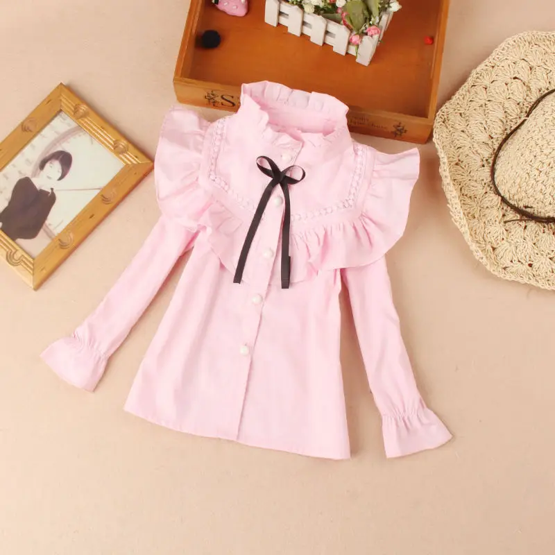 Весна-Осень 2020, школьные топы с длинными рукавами и бантом и оборками белого и красного цвета для девочек, детские рубашки, одежда для малышей и подростков, блузка для девочек