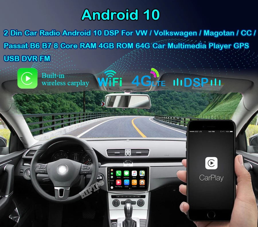 Автомагнитола 2 Din, Android 10, dsp, для VWVolkswagenMagotanCCPassat B6 B7, ОЗУ 4 Гб, ПЗУ 64 ГБ, Автомобильный мультимедийный плеер, GPS, USB, DVR, FM
