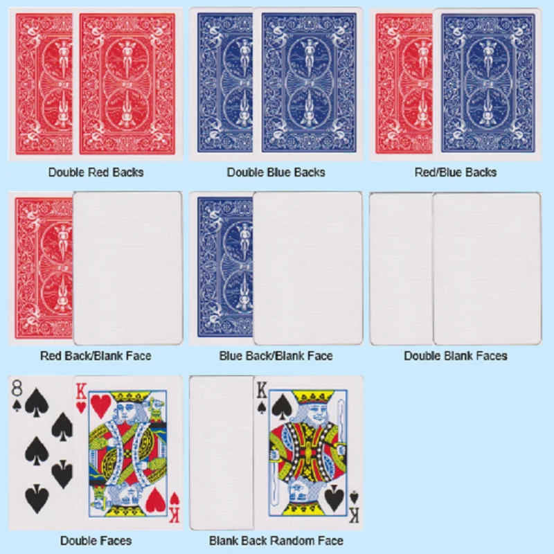 Эти карты, также известные как палубы «gaff», используются для магии карт (или для трюков с друзьями). С обеих сторон карты указаны цифры, без спинки.Каждая колода содержит 56 карт. У них есть отделка велосипедной подушки.