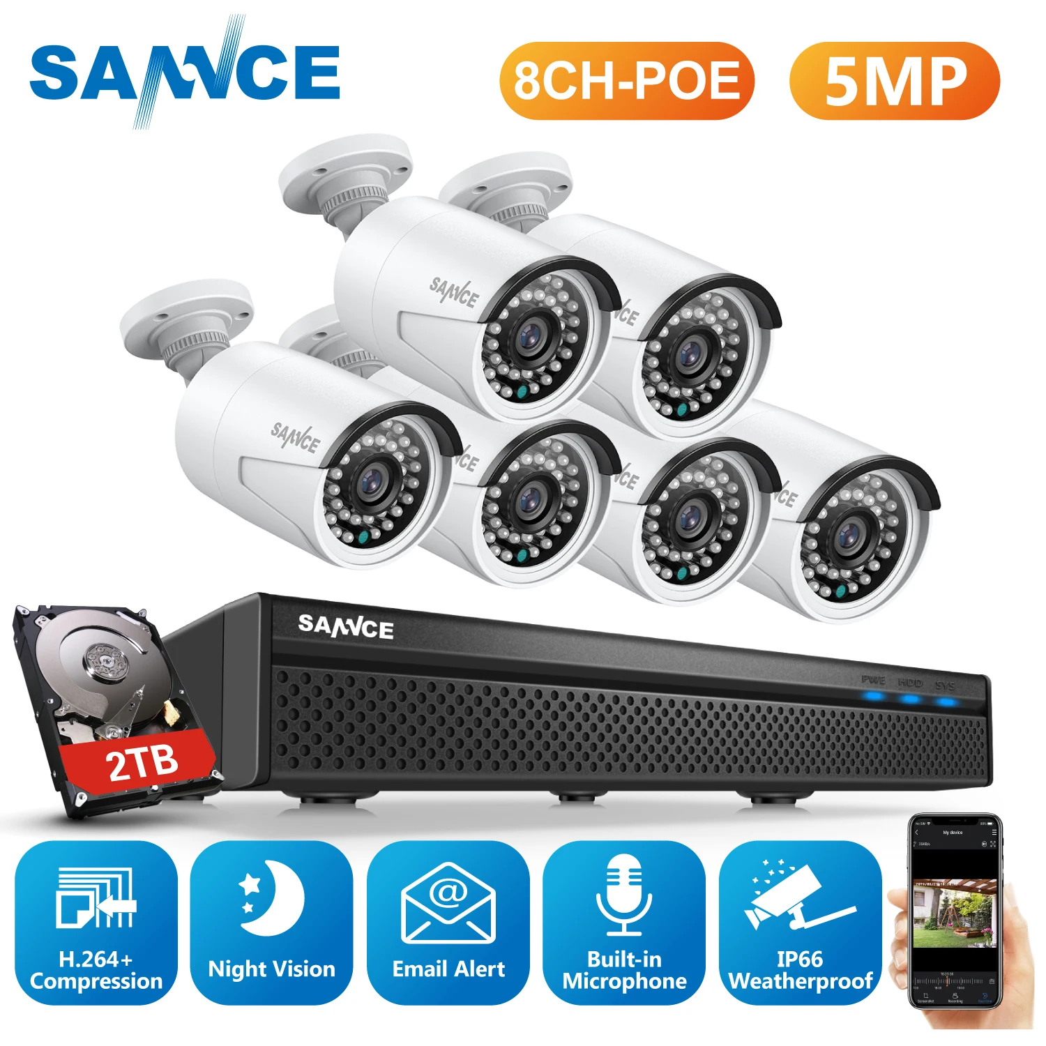 Система видеонаблюдения SANNCE, водонепроницаемая, 5 МП, 8 каналов, H.264, POE, 6 шт.