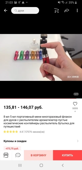 Флакончики- супер! Просто незаменимы в женской сумочке: и компактны, и легки, и удобны в использовании! Заполняются легко и просто: снимаете головку-распылитель с основного флакона, насаживаете на его стержень отверстие этого и нажимаете-нажимаете-нажимаете до заполнения необходимого вам объёма! Работает прекрасно- проверено! Доставка очень быстрая: заказ оформлен 28 августа, а получен уже 15 сентября в Великом Устюге Вологодской области. Заказывала сразу несколько флаконов различных расцветок и объёмов, чтобы не путать ароматы, ну и в подарочек дочурке. Рекомендую однозначно! Средняя цена вышла порядка 82₽!