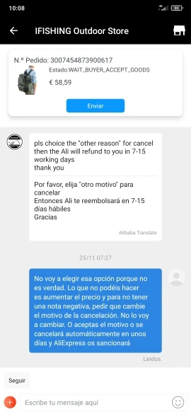 Продавец-обманщик. В последний момент я хотел увеличить цену или отменить заказ, но указав, что это было по другим причинам, а не по причине увеличения цены. Так как я не принимаю, то, что они сделали, ждать до последнего момента, чтобы сделать фиктивную пересылку, которая никогда не прибыла. Я должен был потребовать вернуть свои деньги с AliExpress. Не доверяйте этому продавцу, они-обманщики.