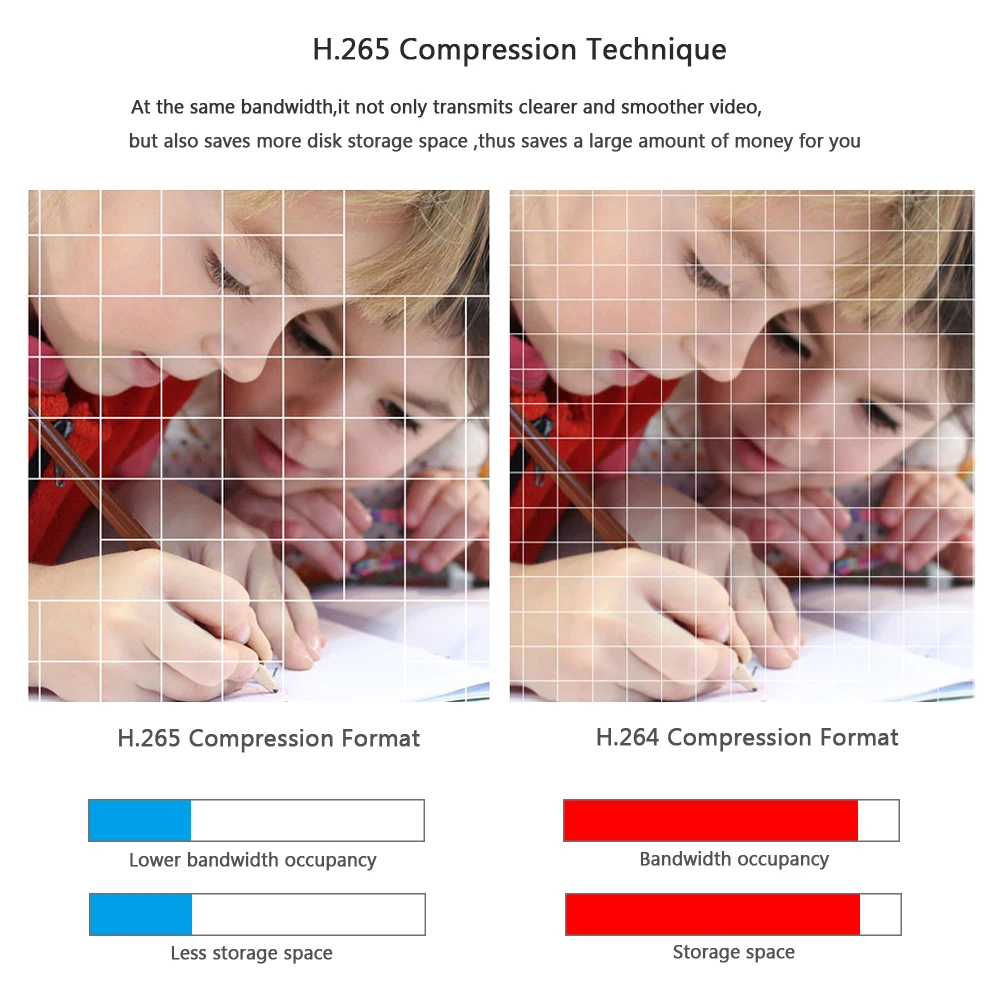По сравнению с H.264, H.265 способен удвоить коэффициент сжатия данных, улучшая при этом качество видео с низкой скоростью передачи данных, он позволяет IP-камере передавать плавное HD-видео с низкой пропускной способностью, в свою очередь, уменьшение пропускной способности сети и Экономия до 50% места для хранения видео.