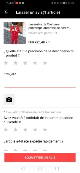Брюки слишком короткие, не очень хорошо подходят. Остальное было в порядке. Очень быстрая доставка (10 дней