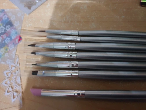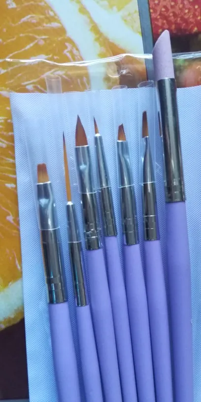 Хорошие кисточки. Ворс мягкий. Длинную тонкую надо выстригать. Кисточка с розовым наконечником, это не силикон. Твёрдая поверхность похоже на пемзу. За такую цену очень достойное качество. Доставка до владивостока 3 недели. Рекомендую.