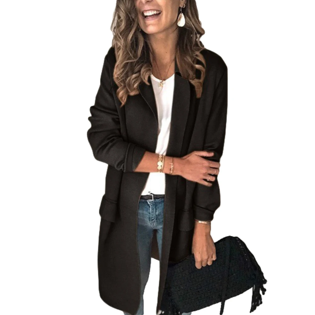 Женский офисный осенний однотонный блейзер с отложным воротником и карманами