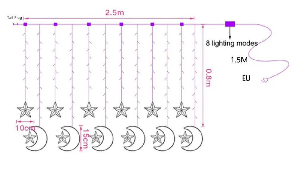 Примечание: у нас есть usb-разъем 5 В и штепсельная вилка европейского стандарта 220 в, пожалуйста, выберите в соответствии с вашими потребностями, спасибо!Наименование товара: Рождественский светодиодный светильник со звездами и ЛунойЦвет: теплый белыйМатериал: медная проволока + пластиковая крышкаДлина: 2,5 м 3,5 мСвинцовый провод (линия): 1,5 мФункция памяти: да/нетКоличество светодиодов: 138LEDНапряжение: 220 В переменного токаСтандарт штепсельной вилки: штепсельная вилка европейского стандартаРежим освещения: 8 режимов-1. Режим постоянного светильник2. Режим вспышки3. Режим мигания4. Непрерывный режим5. Волновой режим6. Фантазийный режим7. Вымерший режим8. Медленный режим вспышкиИспользование:Идеально подходит для свадебных фонов, отелей, ресторанов, коммерческих зданий, дома, окон, клубов, концертов, караоке, модных шоу, танцевального зала и т. д. Уведомления:1. Хотя большинство наших ламп может использоваться на открытом воздухе в самых экстремальных условиях, все равно важно защитить источник питания и контроллер, особенно в дождь или снег.Штепсельная Вилка европейского стандарта