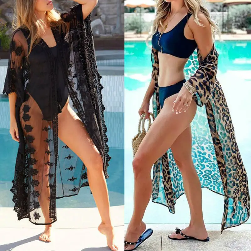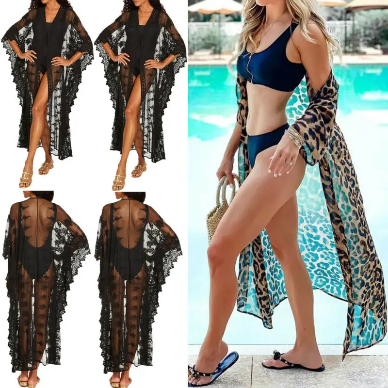Летний женский сексуальный с коротким рукавом, Леопардовыйвышитый, прозрачный, на шнуровке, с кисточками, пляжный, для купания, накидка для бикини, кардиган