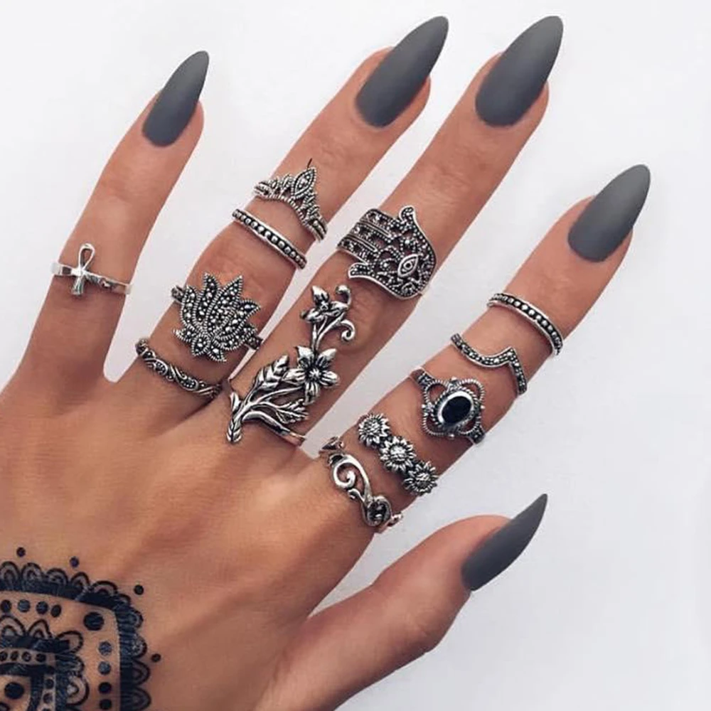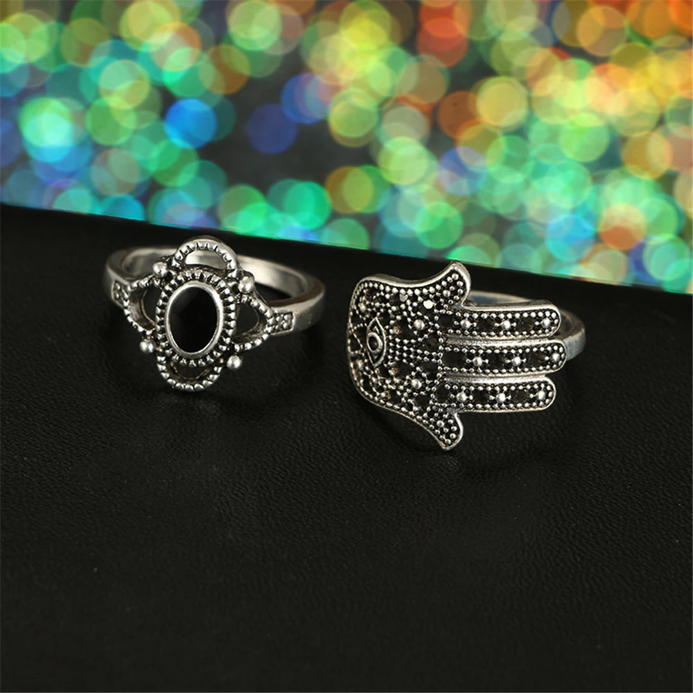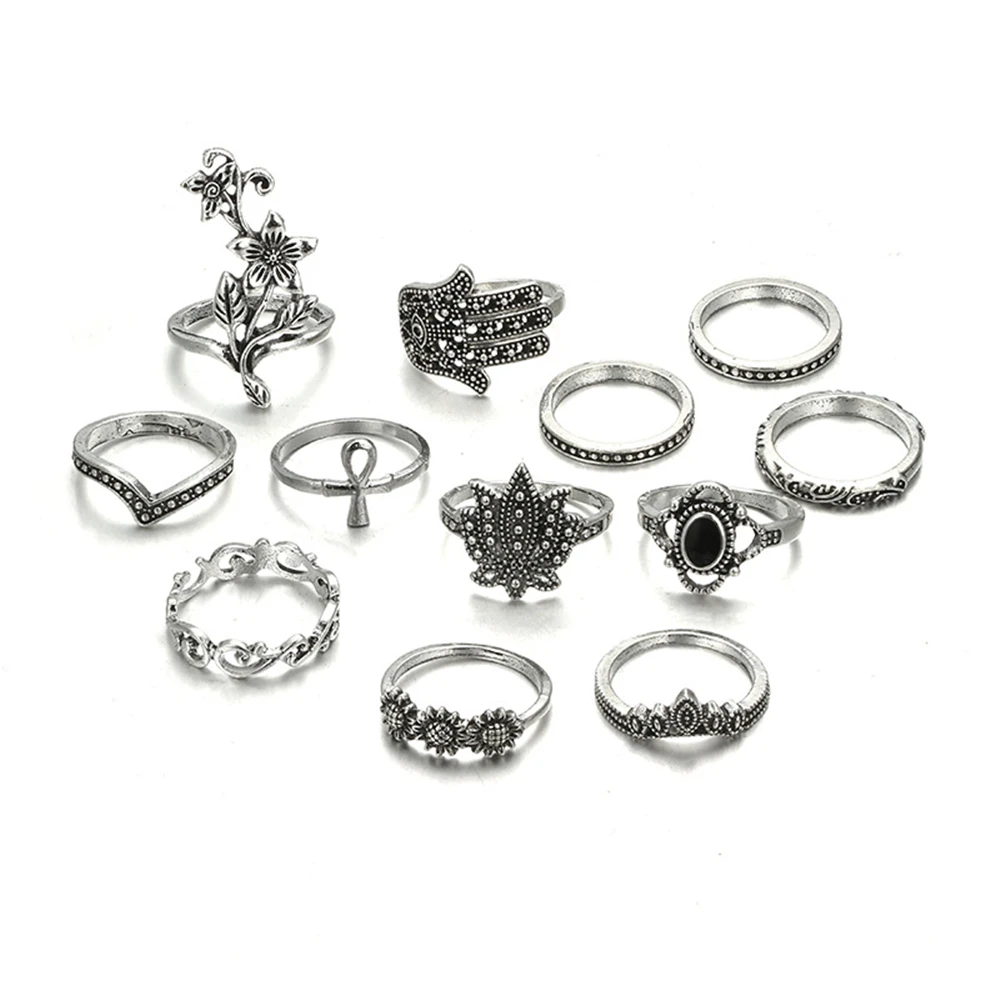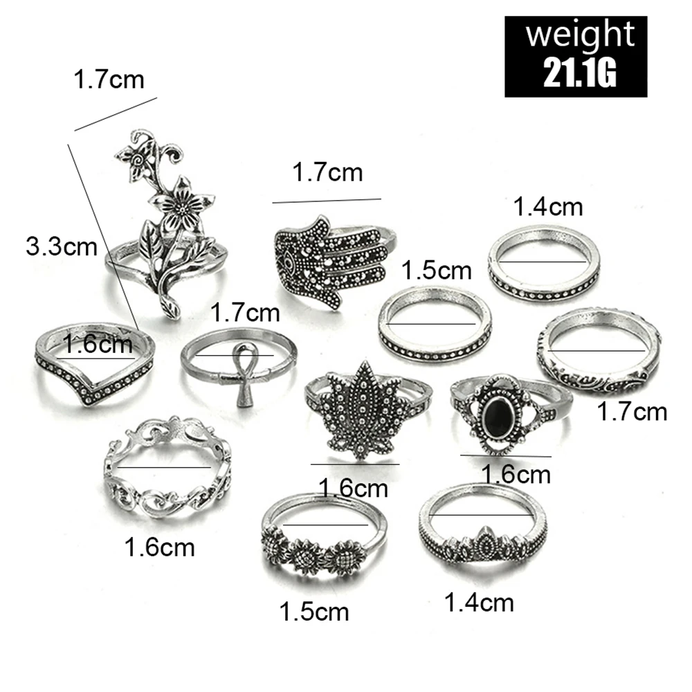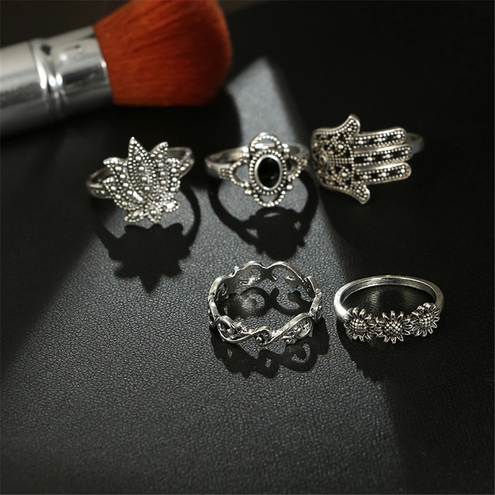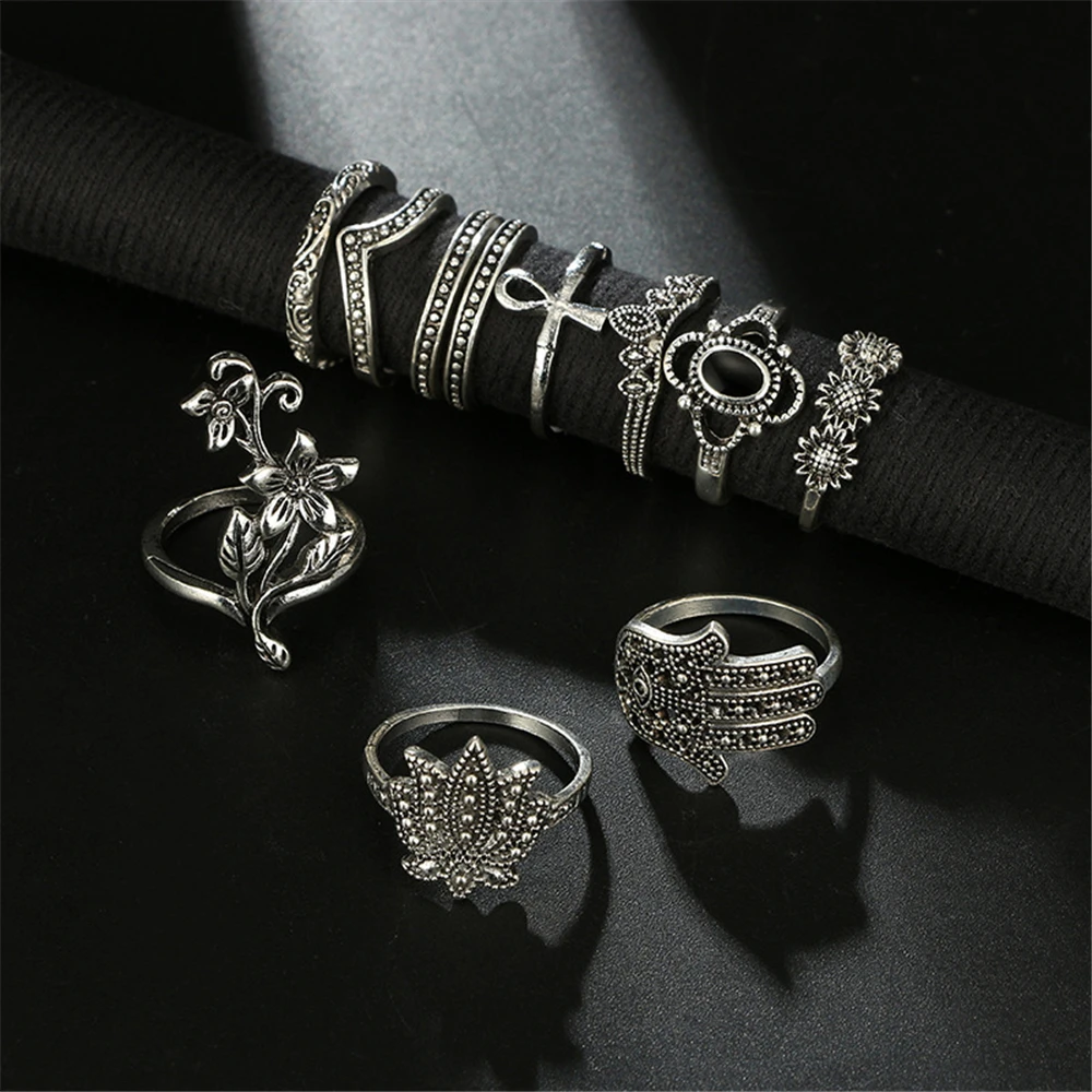 12 шт.компл., Винтажное кольцо с цветком лотоса, Фатима, кольцо с крестом и подсолнухом, набор женских серебряных колец, вечерние кольца, модные ювелирные изделия