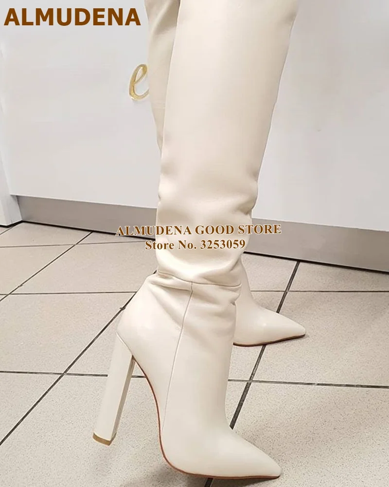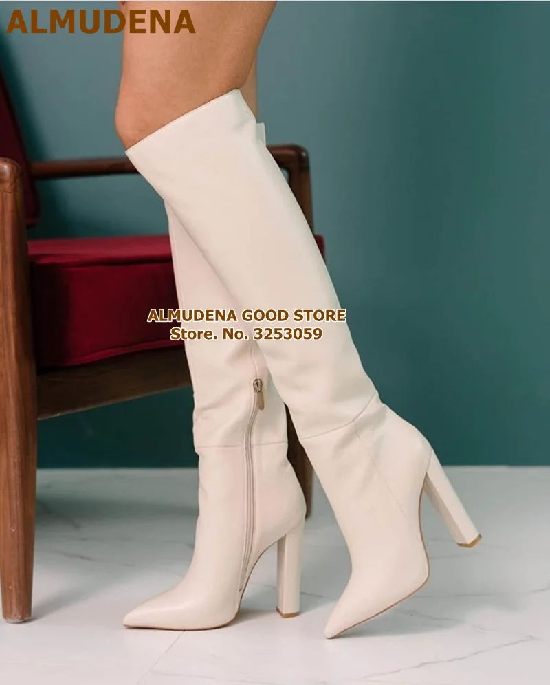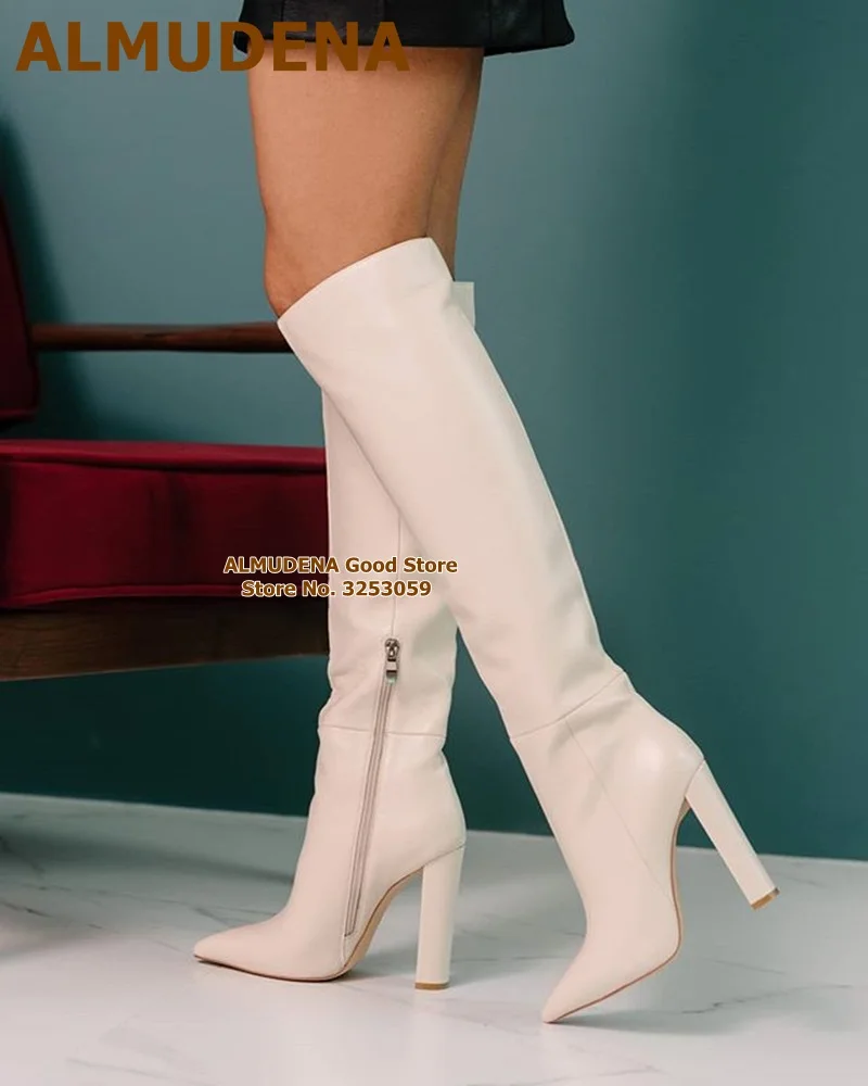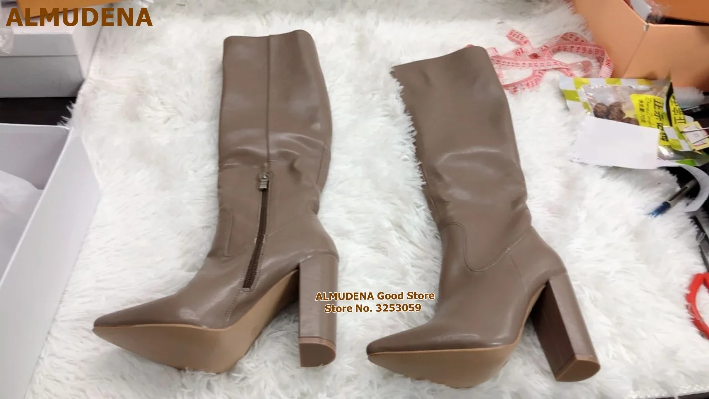 Женские матовые кожаные сапоги до колена ALMUDENA на массивном каблуке с острым носком, длинные сапоги на молнии, высокие сапоги, Классическая обувь, белые, черные, кофейные