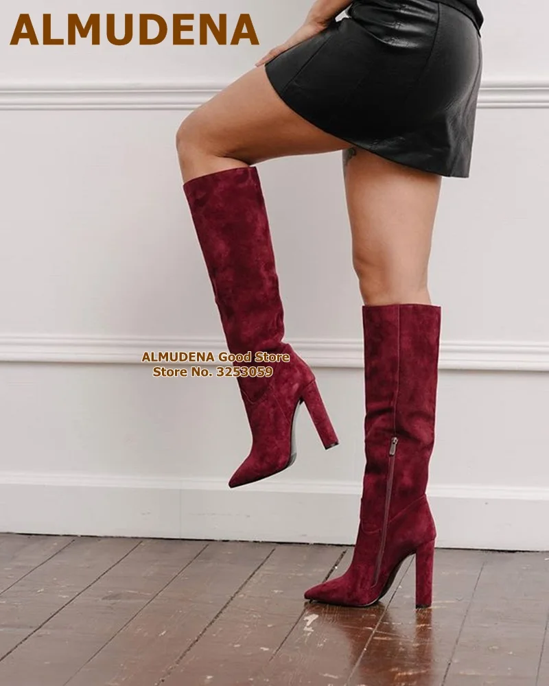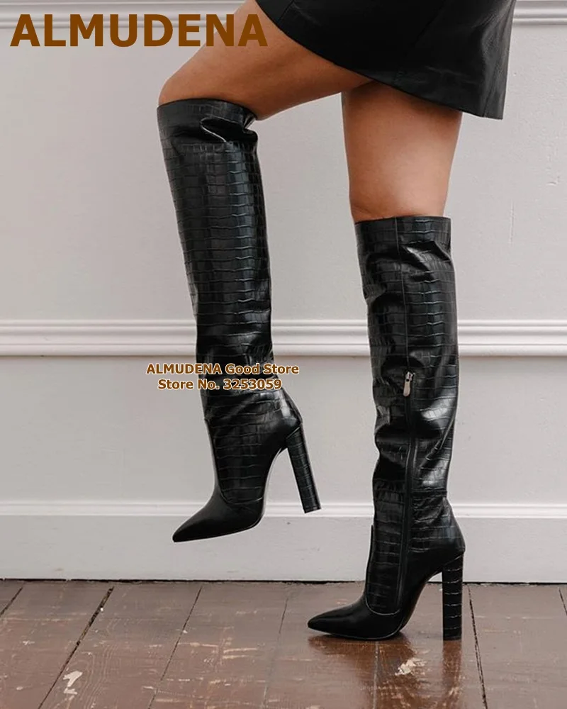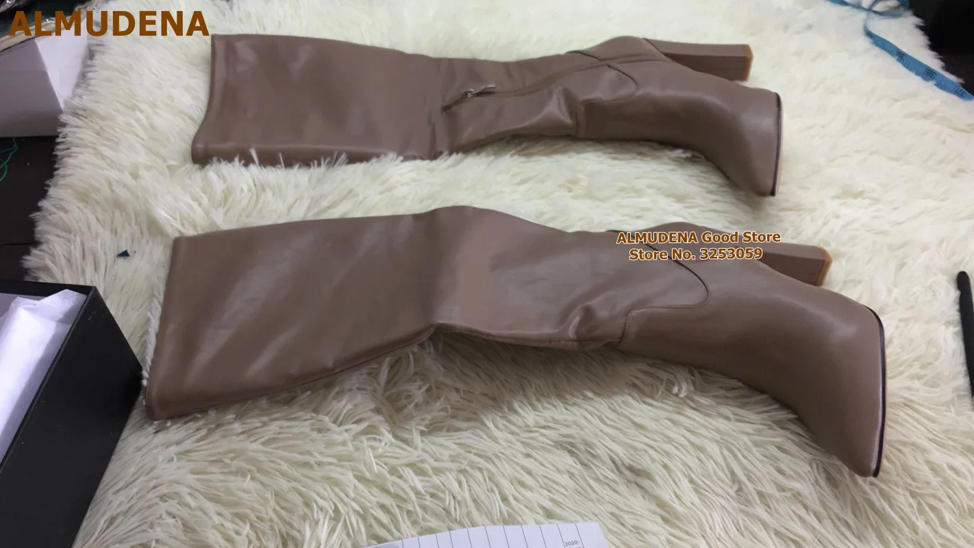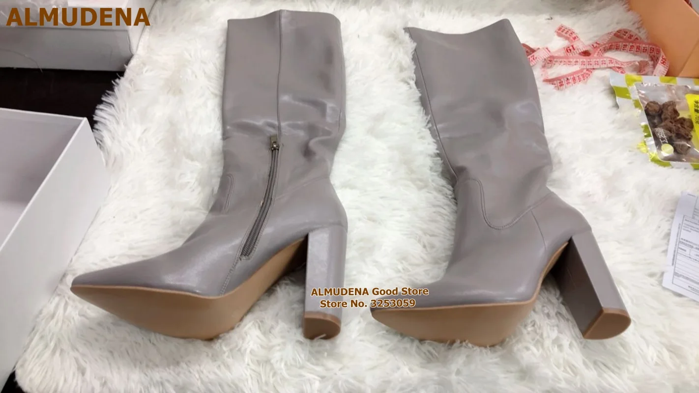 Женские матовые кожаные сапоги до колена ALMUDENA на массивном каблуке с острым носком, длинные сапоги на молнии, высокие сапоги, Классическая обувь, белые, черные, кофейные