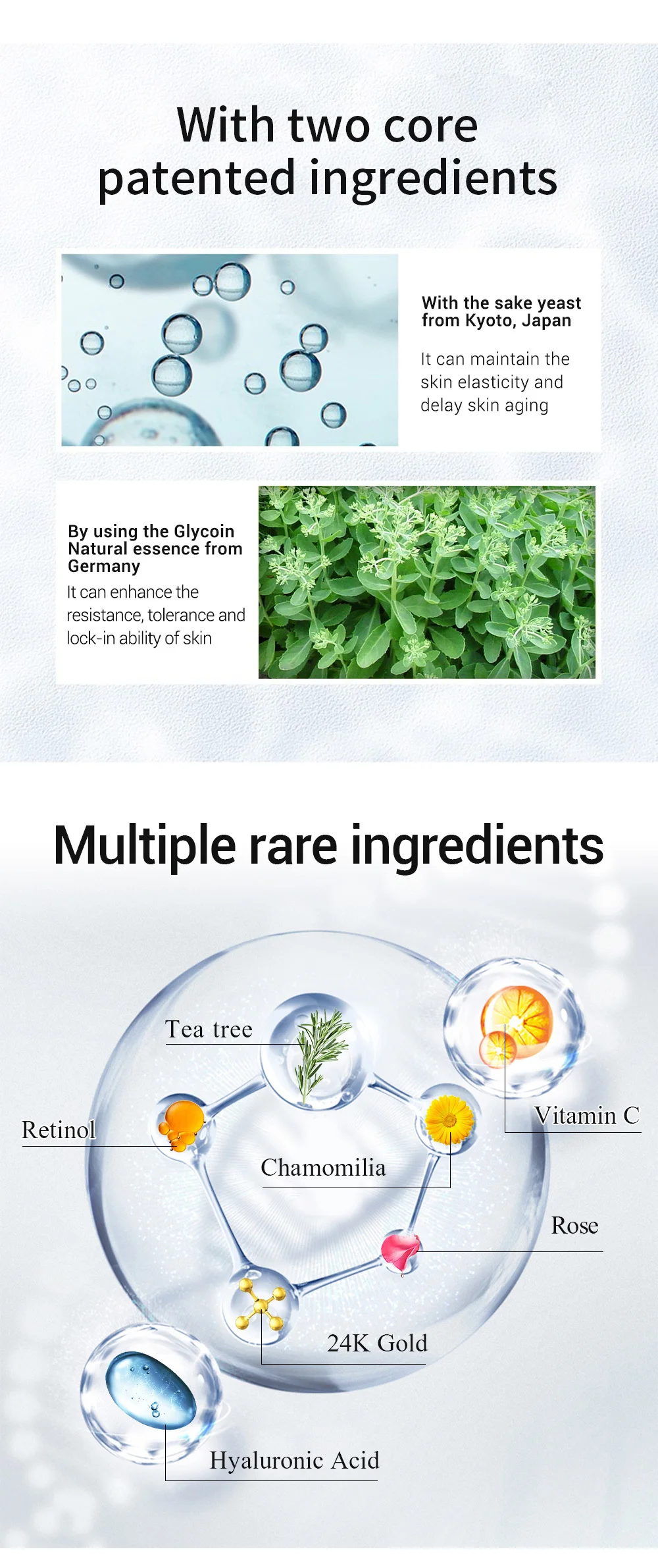 С двумя запатентованными ингредиентамиС Саке Дрожжи из киао, ЯпонияОн может поддерживать эластичность кожи и замедлять старение кожиИспользуя естественную эссенцию гликоина из ГерманииОн может повысить устойчивость, толерантность и блокировку кожиНесколько редких ингредиентовЧайное деревоРетинолХамомилияВитамин СРоза24K золотоГиалуроновая кислота