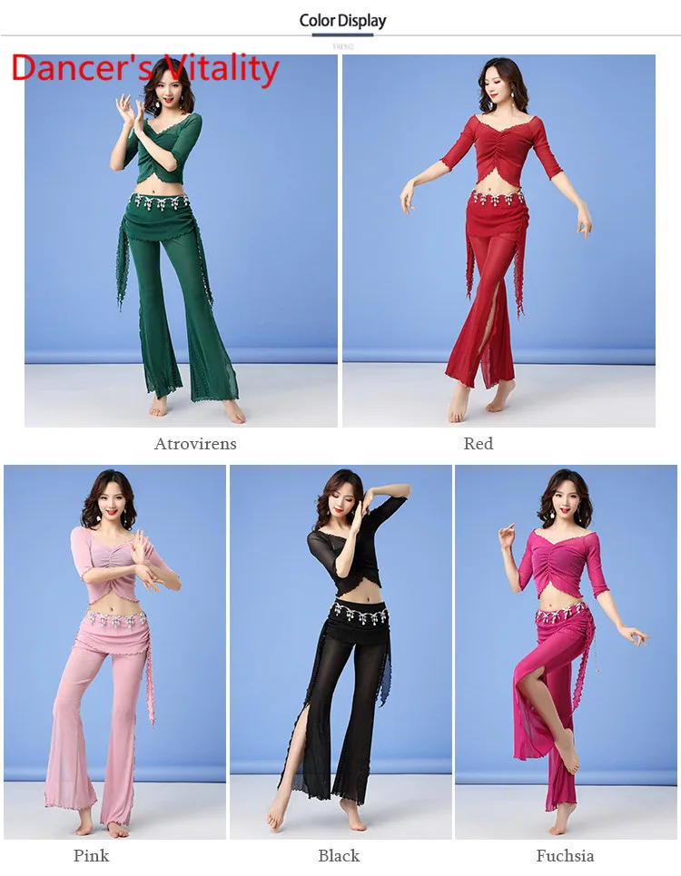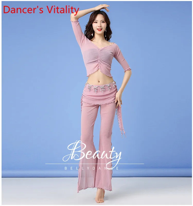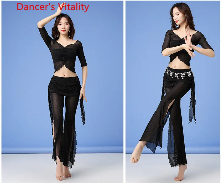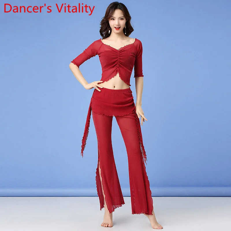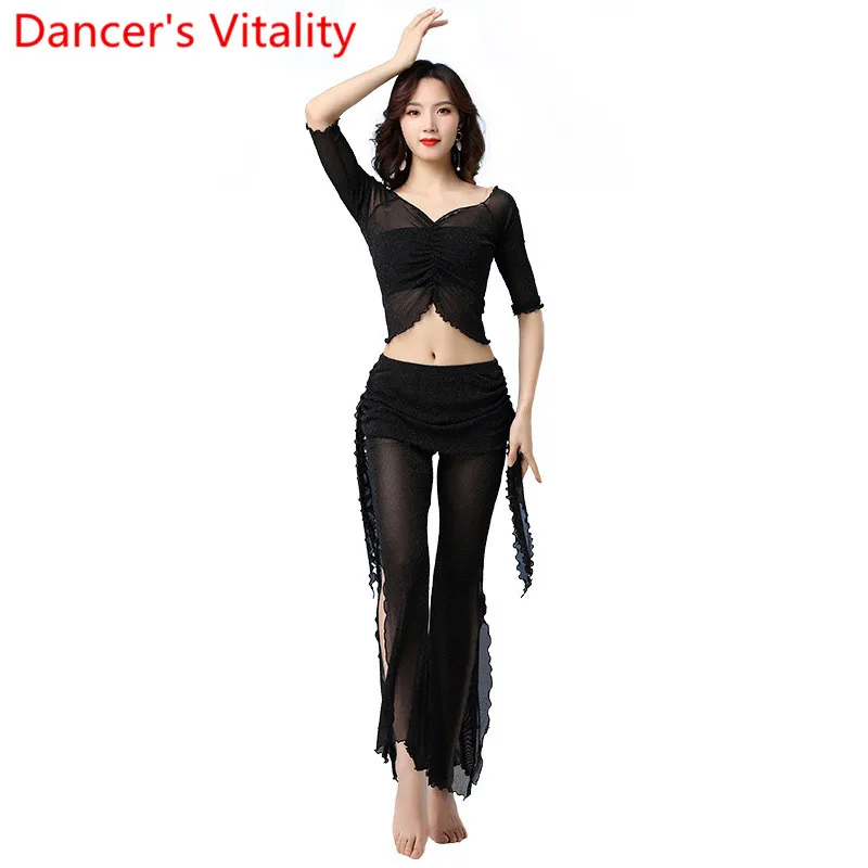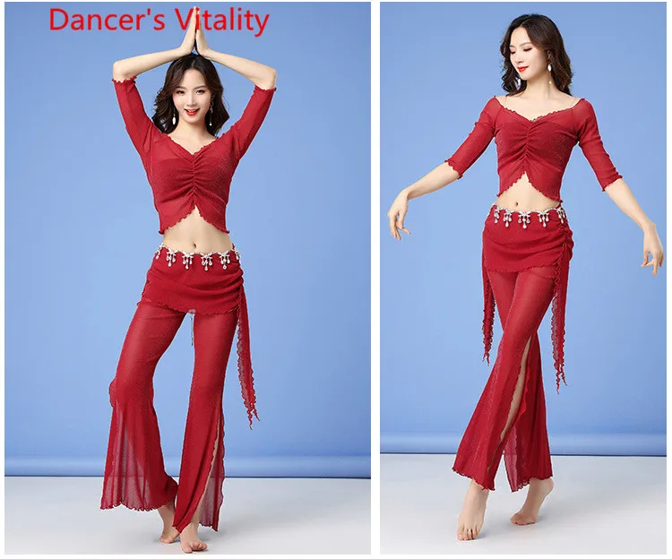 Зимняя женская одежда для танца живота, топ с коротким рукавом, штаны с разрезом, восточные индийские танцевальные костюмы для начинающих сценических тренировок