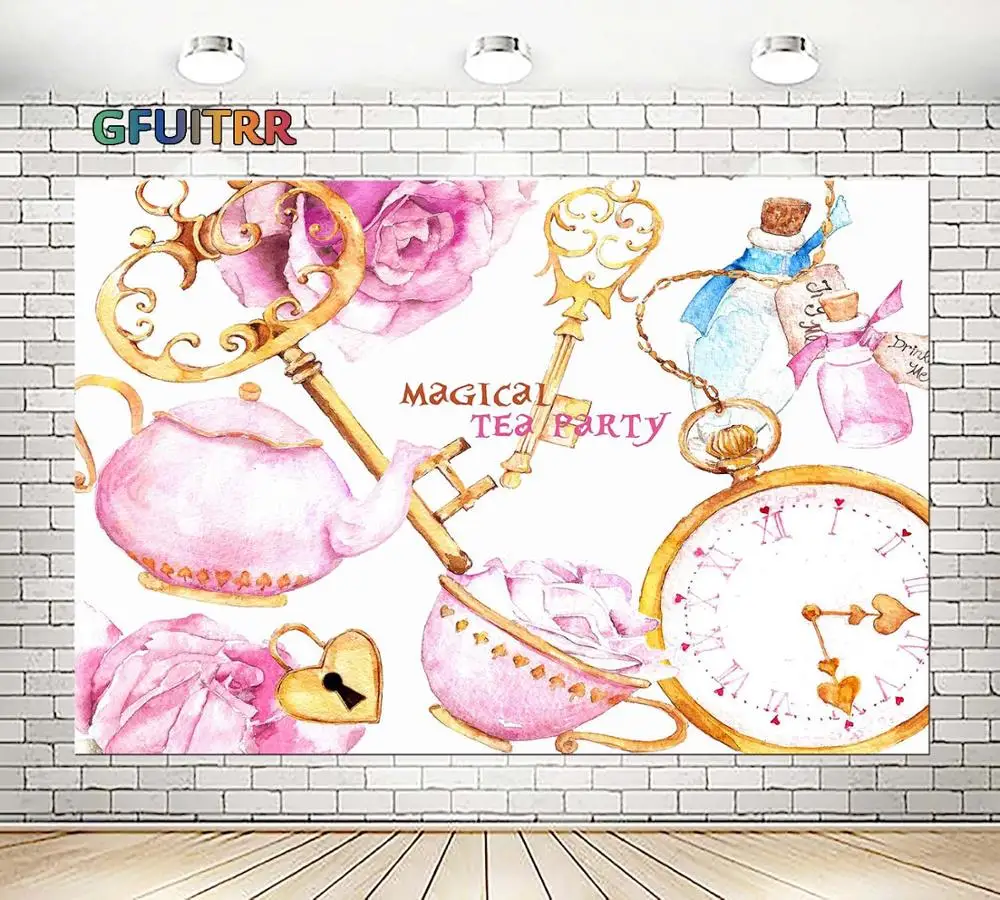Виниловый фон для фотосъемки с изображением Алисы в стране чудес, розовых часов и чайника, 7x5 футов