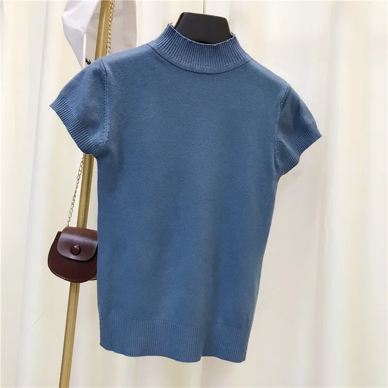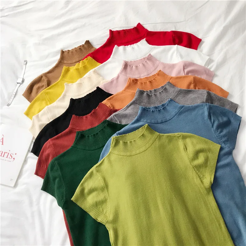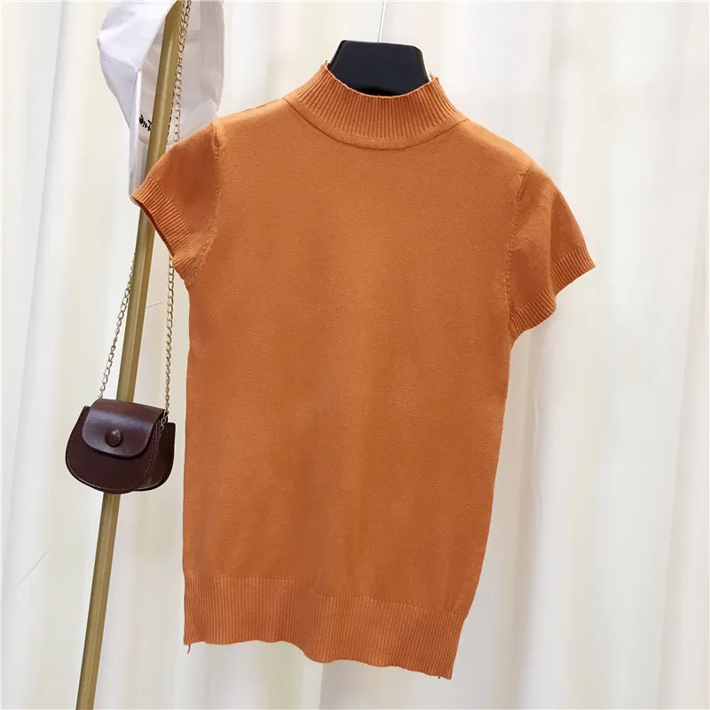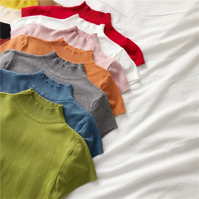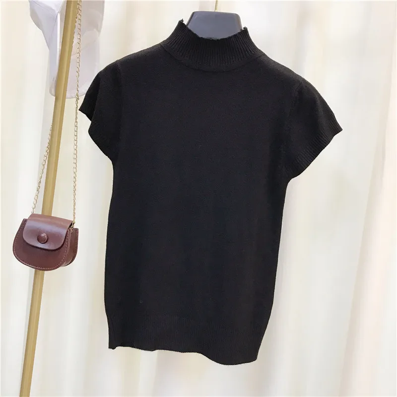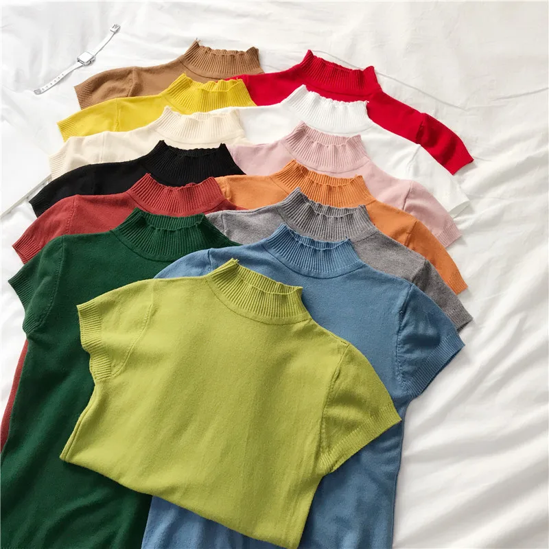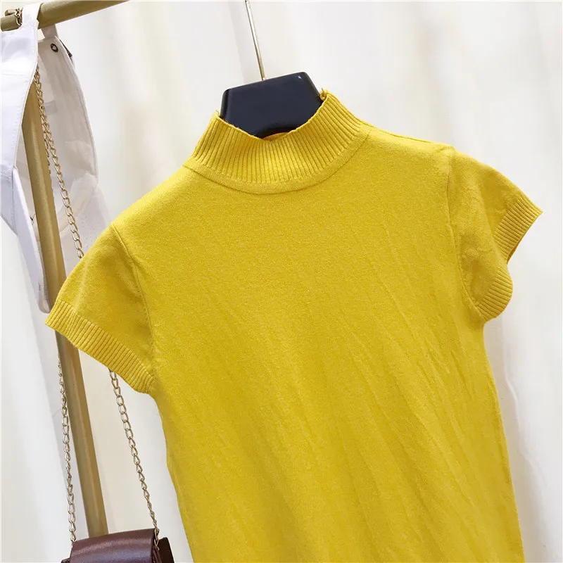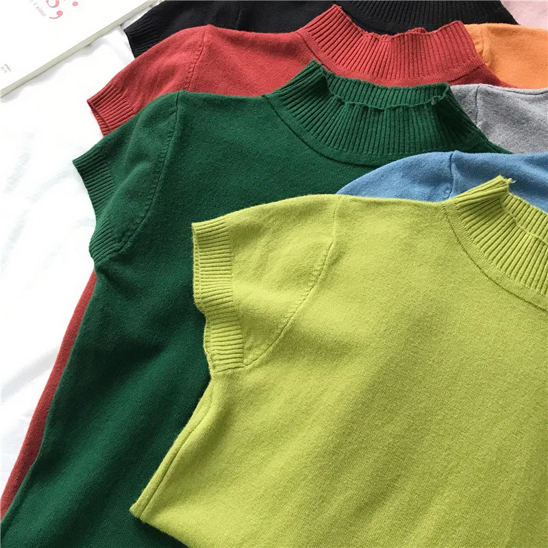 Свитер женский однотонный с коротким рукавом, Мягкая вязаная водолазка с коротким рукавом, большие эластичные пуловеры, топы, весна 2020
