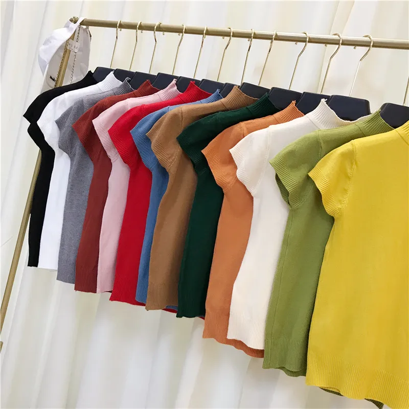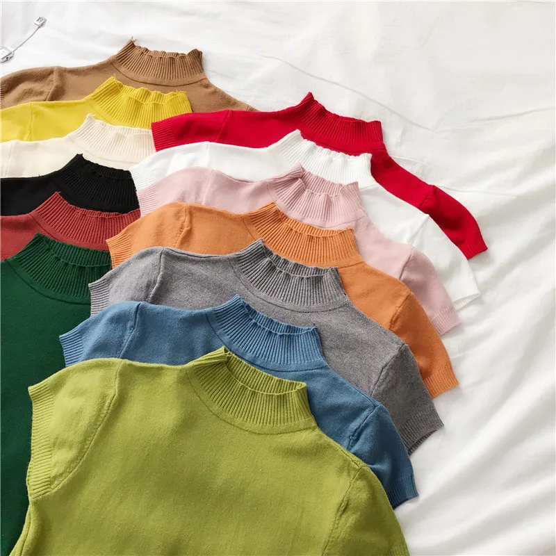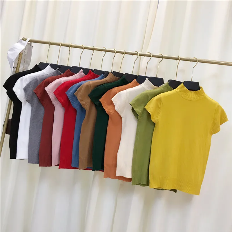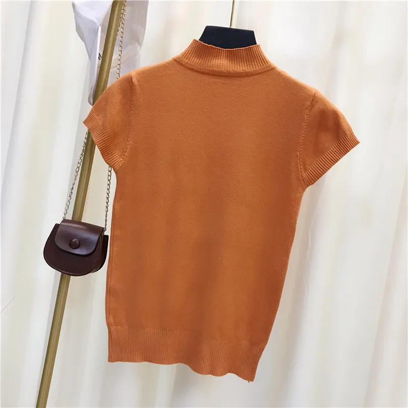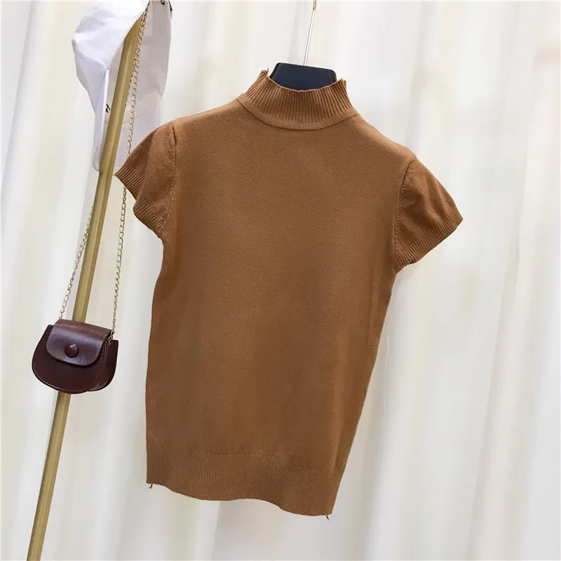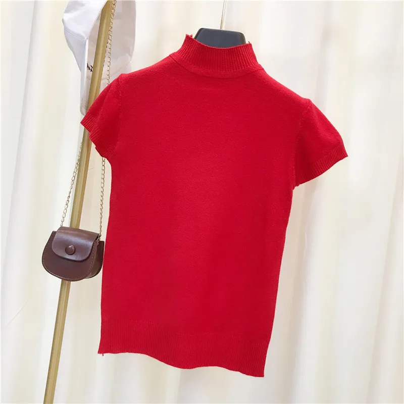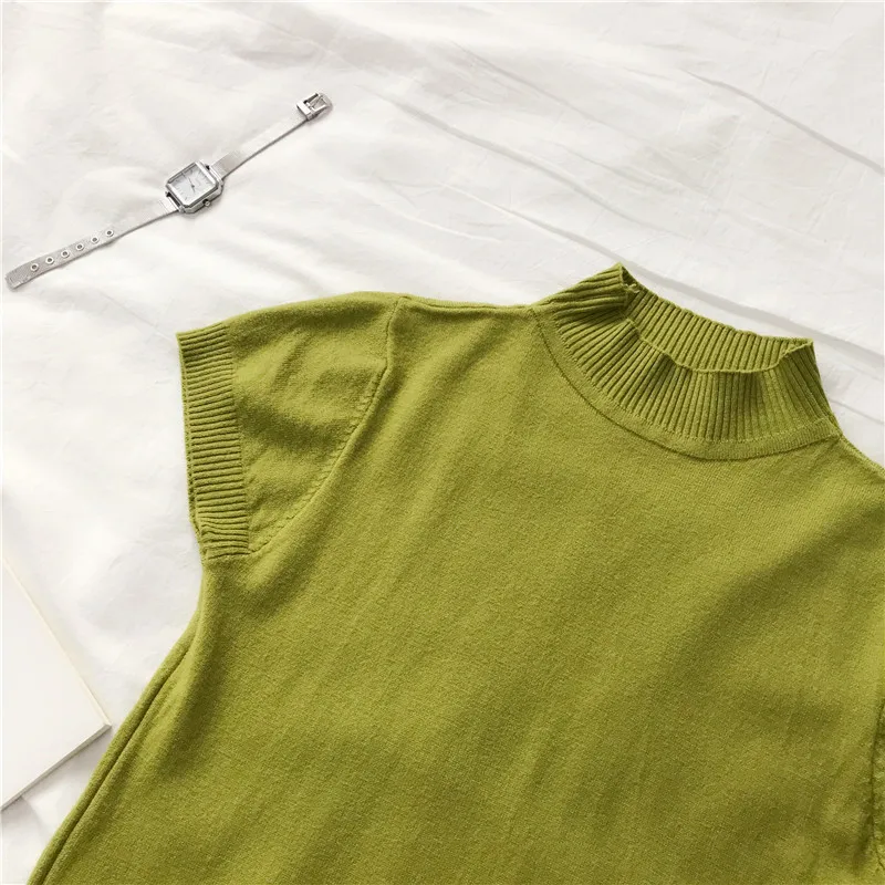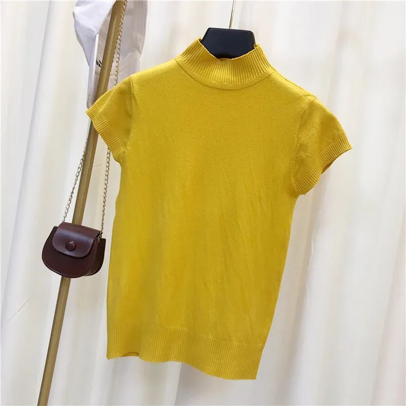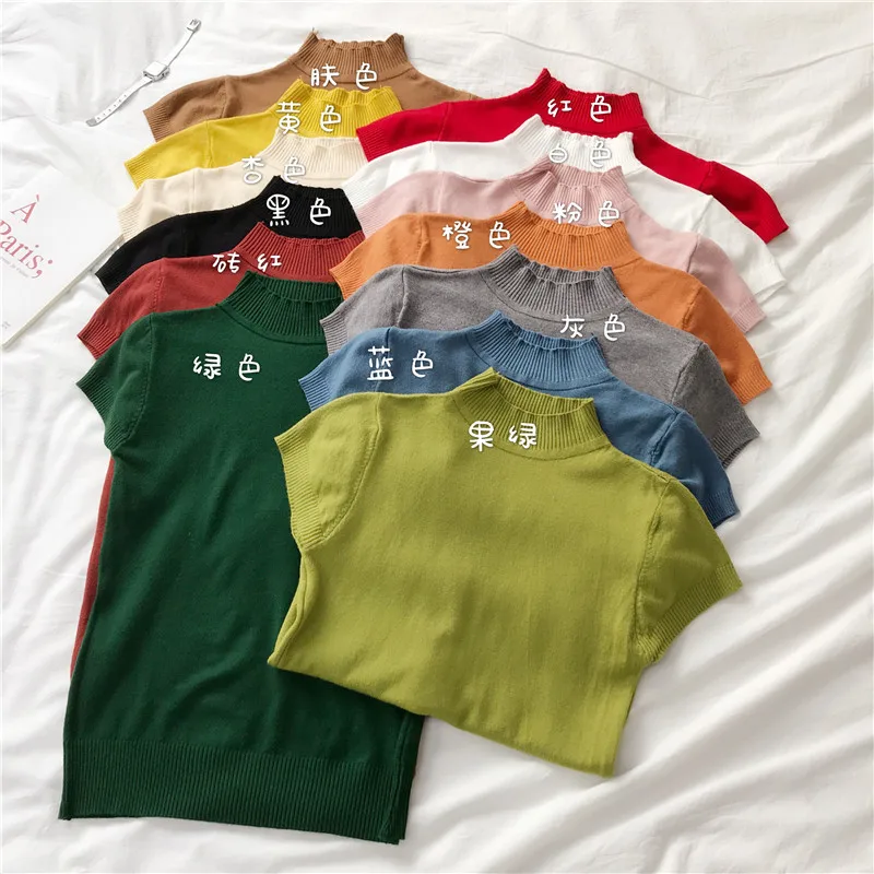 Свитер женский однотонный с коротким рукавом, Мягкая вязаная водолазка с коротким рукавом, большие эластичные пуловеры, топы, весна 2020