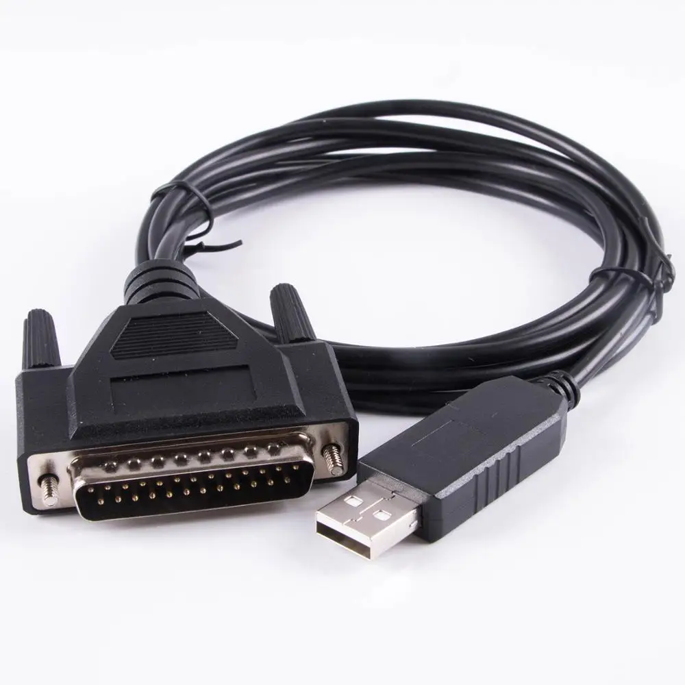 Этот кабель предназначен для подключения между usb-портом и серийными устройствами (RS232), а не для параллельного принтера или других устройств на основе параллельного протокола (IEEE-1284), хотя оба типа имеют разъем DB25. Это USB к последовательному кабелю с программным обеспечением Handshaking с использованием только трех сигналов: TXD(Pin2), RXD(pin3) и GND(pin7). Проверьте настройки устройств перед покупкой.
