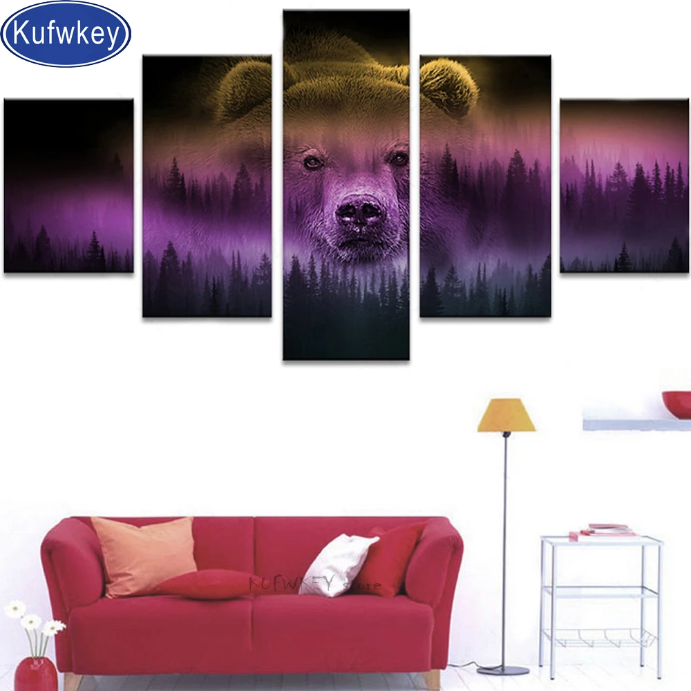 Набор для алмазной 5d вышивки медведь пурпурный, 5 панельных элементов, полная выкладка, Набор для вышивки крестиком, мозаика, животное