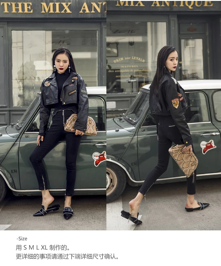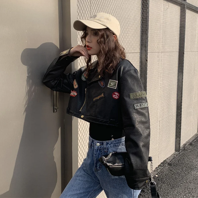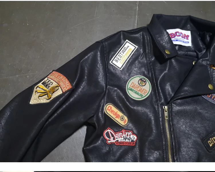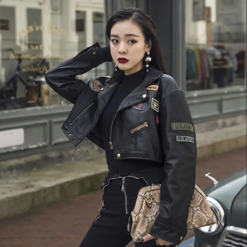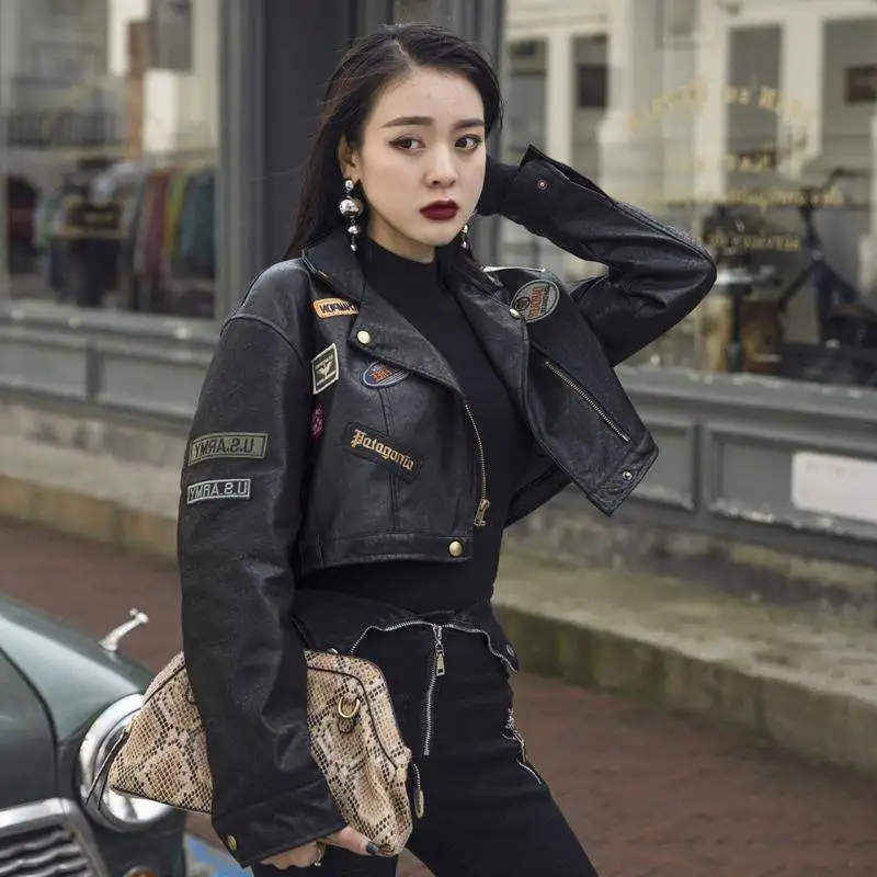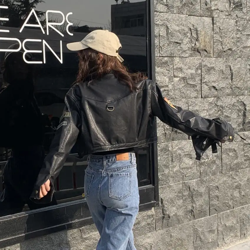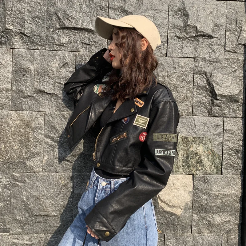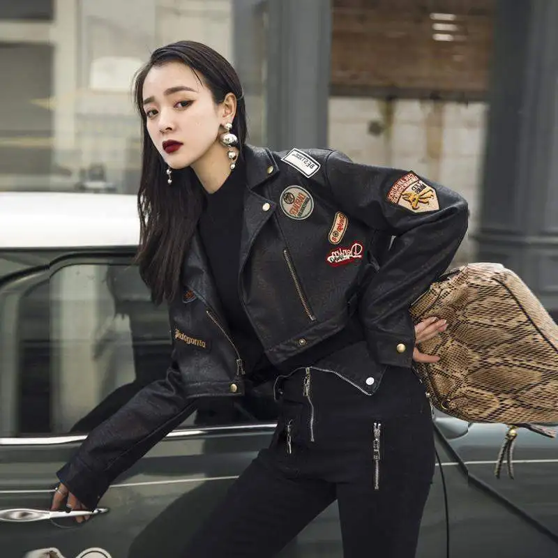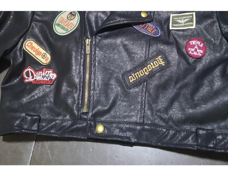 Модное локомотивное короткое теплое пальто из искусственной кожи женская эполета аппликация вышивка дизайн ретро кожаные куртки F830