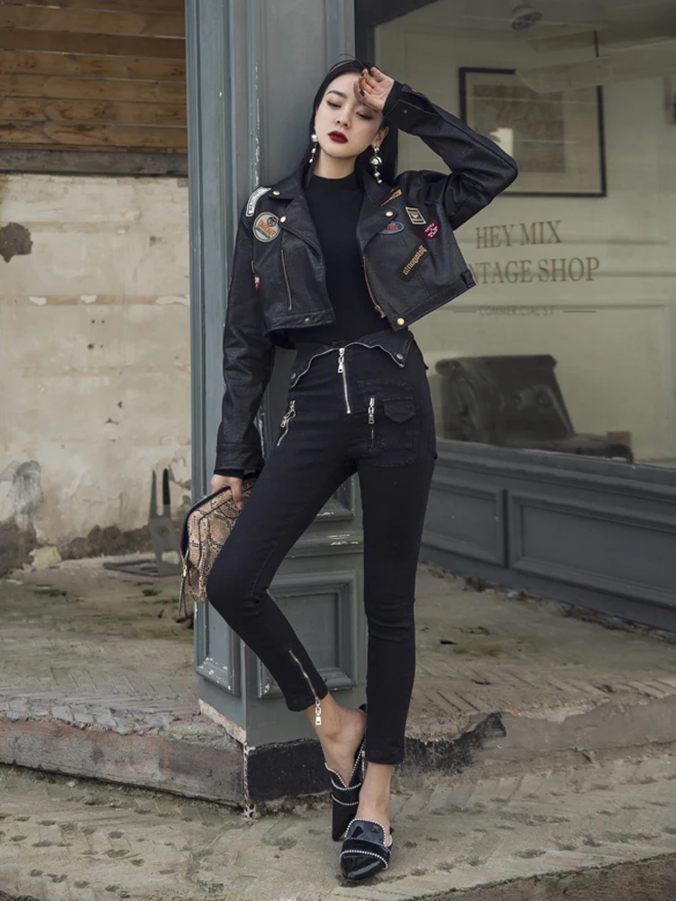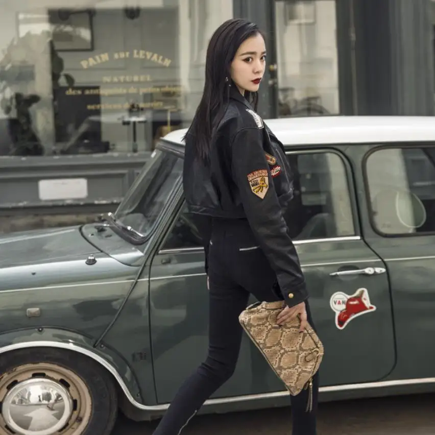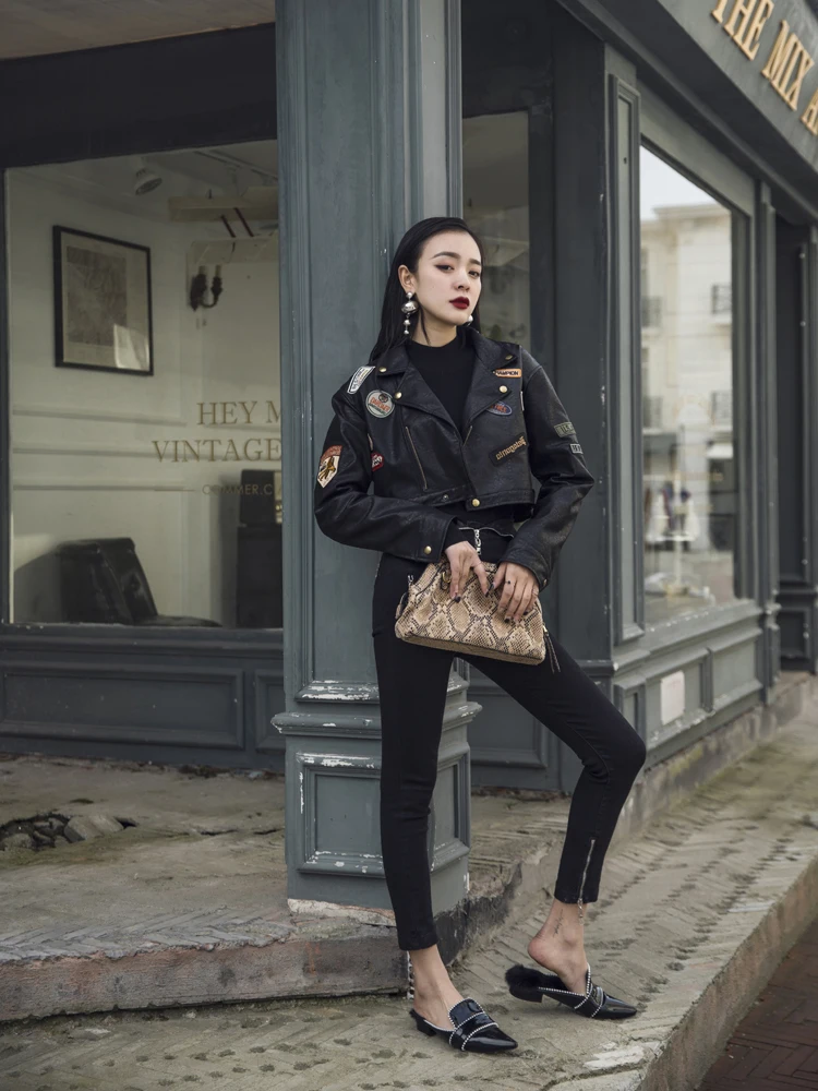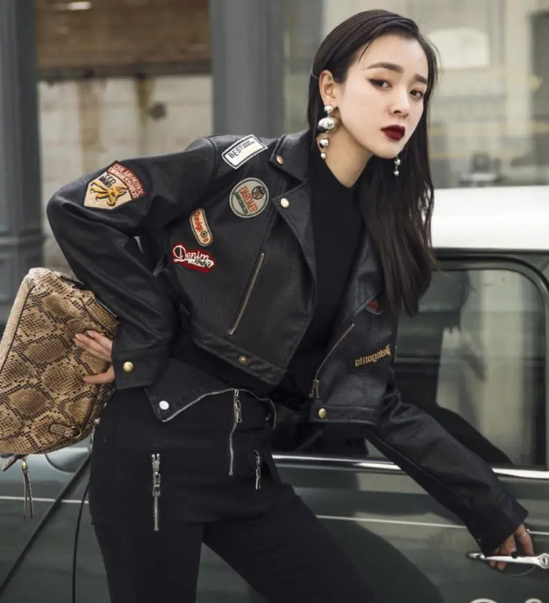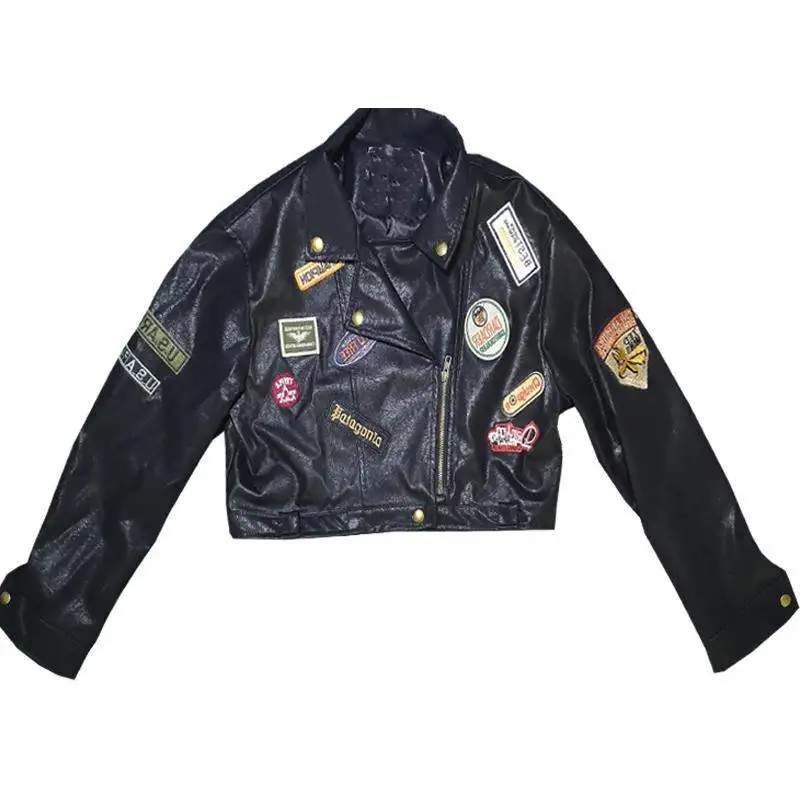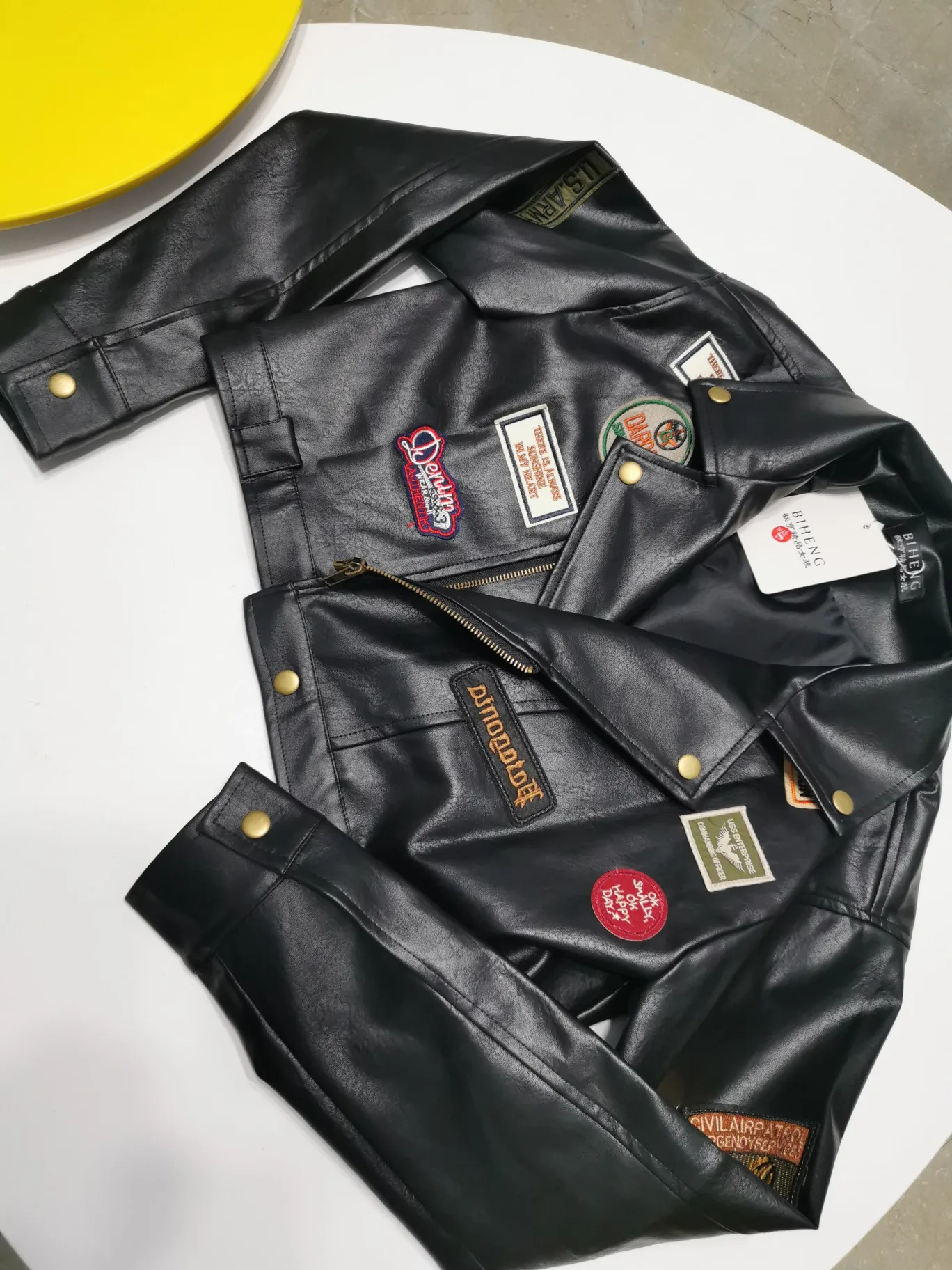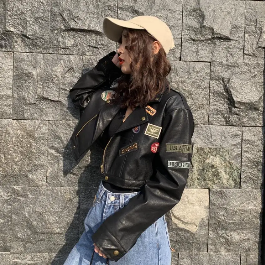 Модное локомотивное короткое теплое пальто из искусственной кожи женская эполета аппликация вышивка дизайн ретро кожаные куртки F830