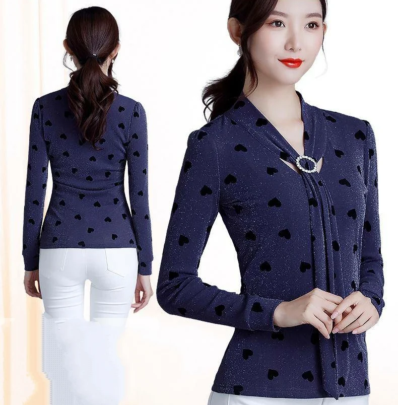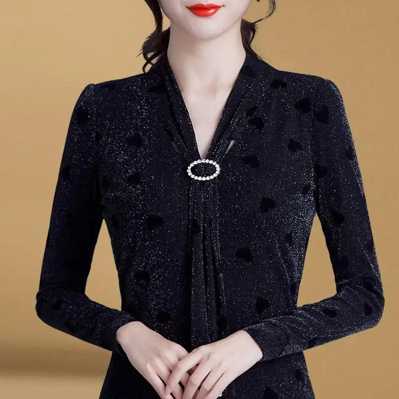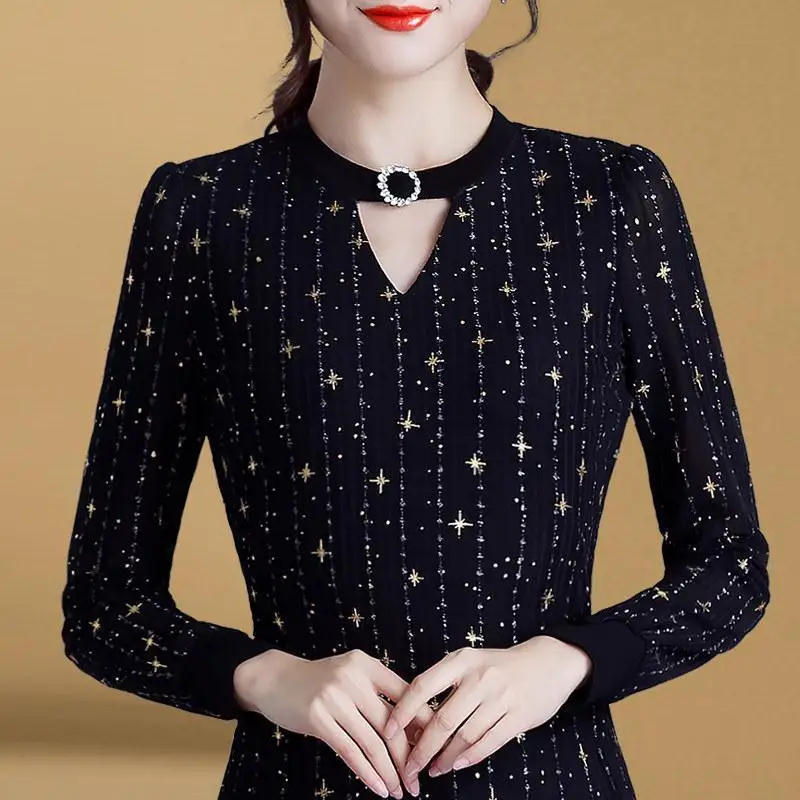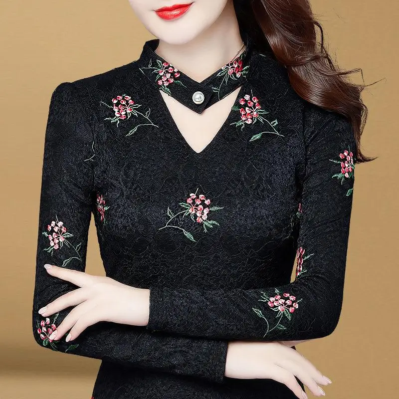 Женская кружевная блузка с длинным рукавом, V-образным вырезом и вышивкой, DD8294