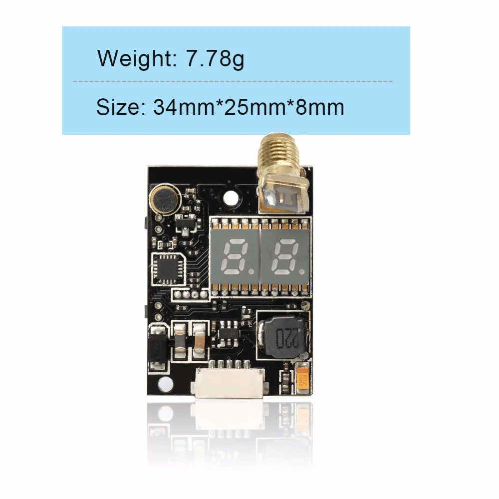 40 каналов, крышка A, b, E ,F, r полосКнопка для изменения каналов и частотДвойной светодиодный дисплей для канала и частотыПамять отключения питания: воспроизведение последнего частотного диапазона и каналаОн поддерживает полный спектр 40 каналов, включая raceband 5645MHz-5945MHz.Характеристика:Этот передатчик FPV 5,8 GHz 40CH имеет двойные кнопки для легкого изменения CH и FR.40 каналов: крышка A, b, E, F, r полос. Малый размер и вес светильник.Спецификация:Формат видео: NTSC/PALВыходное сопротивление: 50 ОмЧастотный диапазон передатчика: 5645-5945 МГцДальность передачи: > 3000 м (открытая площадь)Разъем антенны: RP-SMA разъемРабочее напряжение: 7-24 ВВыходное напряжение (выход): 5 ВТок поставки: 280 мАРабочая температура: -10 + 85 CШирина видеосъемки: 0-8,0 МГцАудио Несущая частота: 6,5 МГцУровень входного видео: 0,8, 1,0, 1,2 Vp-pСопротивление входного видео: 75 ОмУровень аудиовхода: 0,5, 2,0 Vp-pСопротивление аудиовхода: 10K OhmВес: 15 г