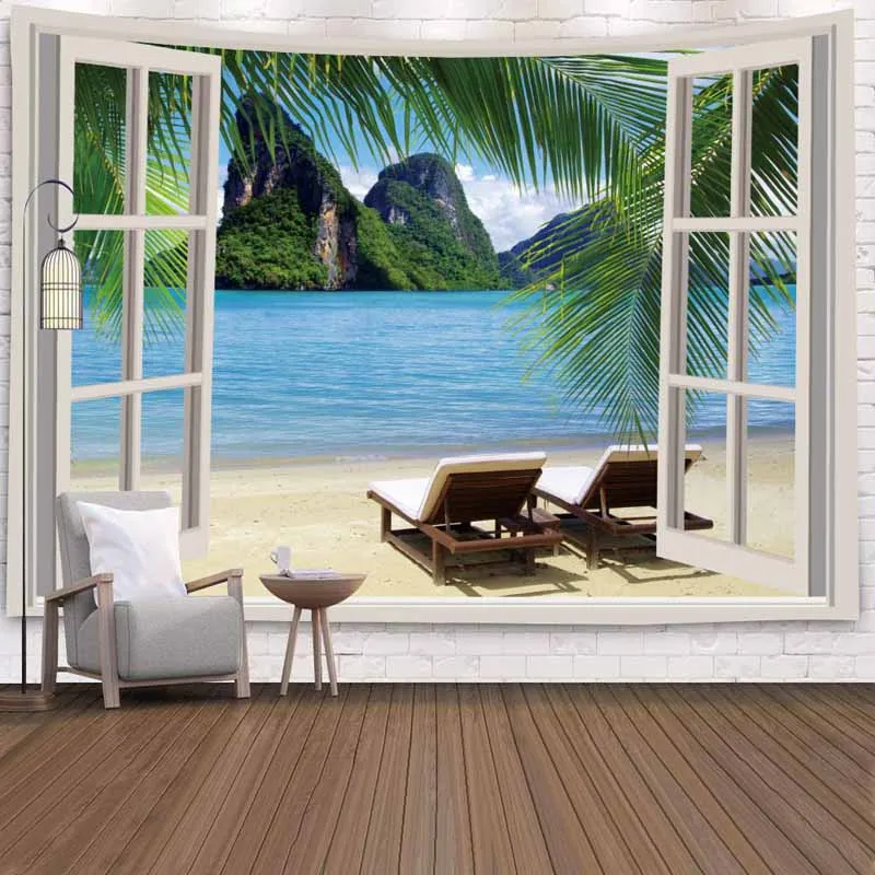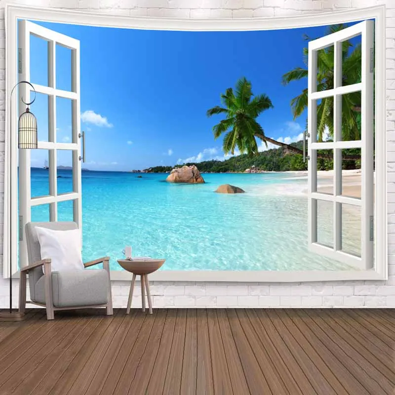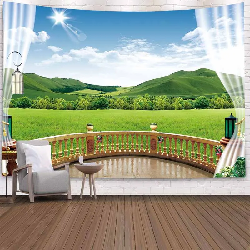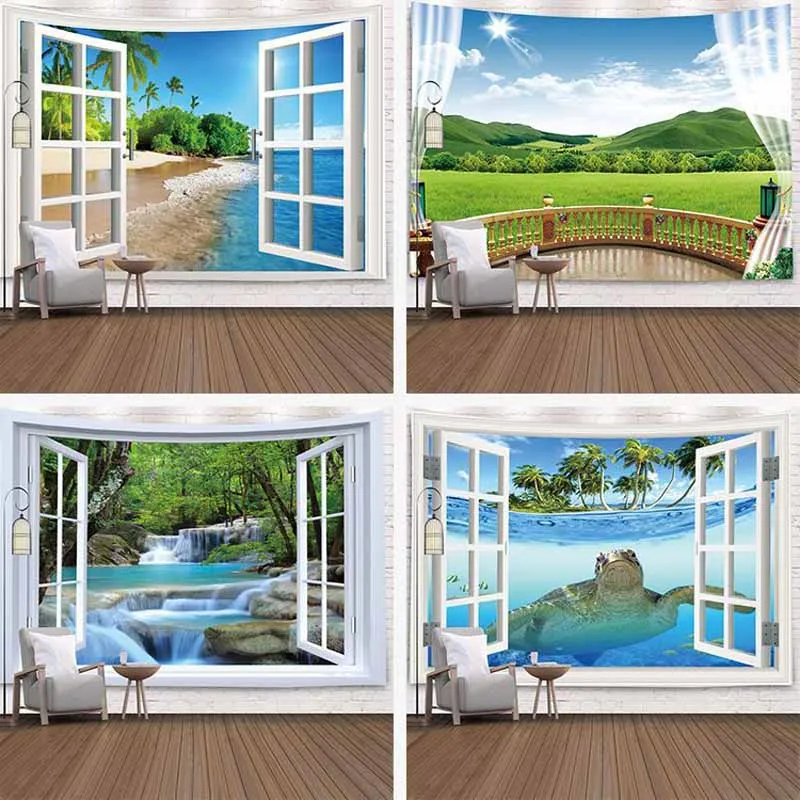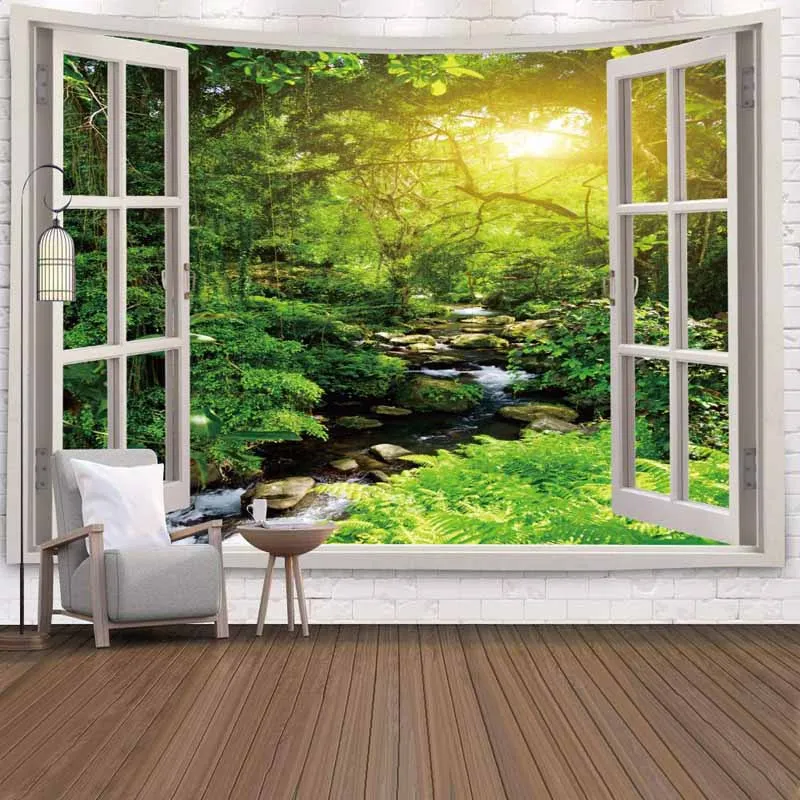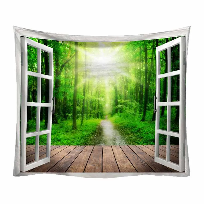 Гобелен с 3D окном, зеленым деревом, лесом, настенный, солнечный свет, настенный, тканевый гобелен, хиппи, Декор, настенное одеяло, психоделический гобелен