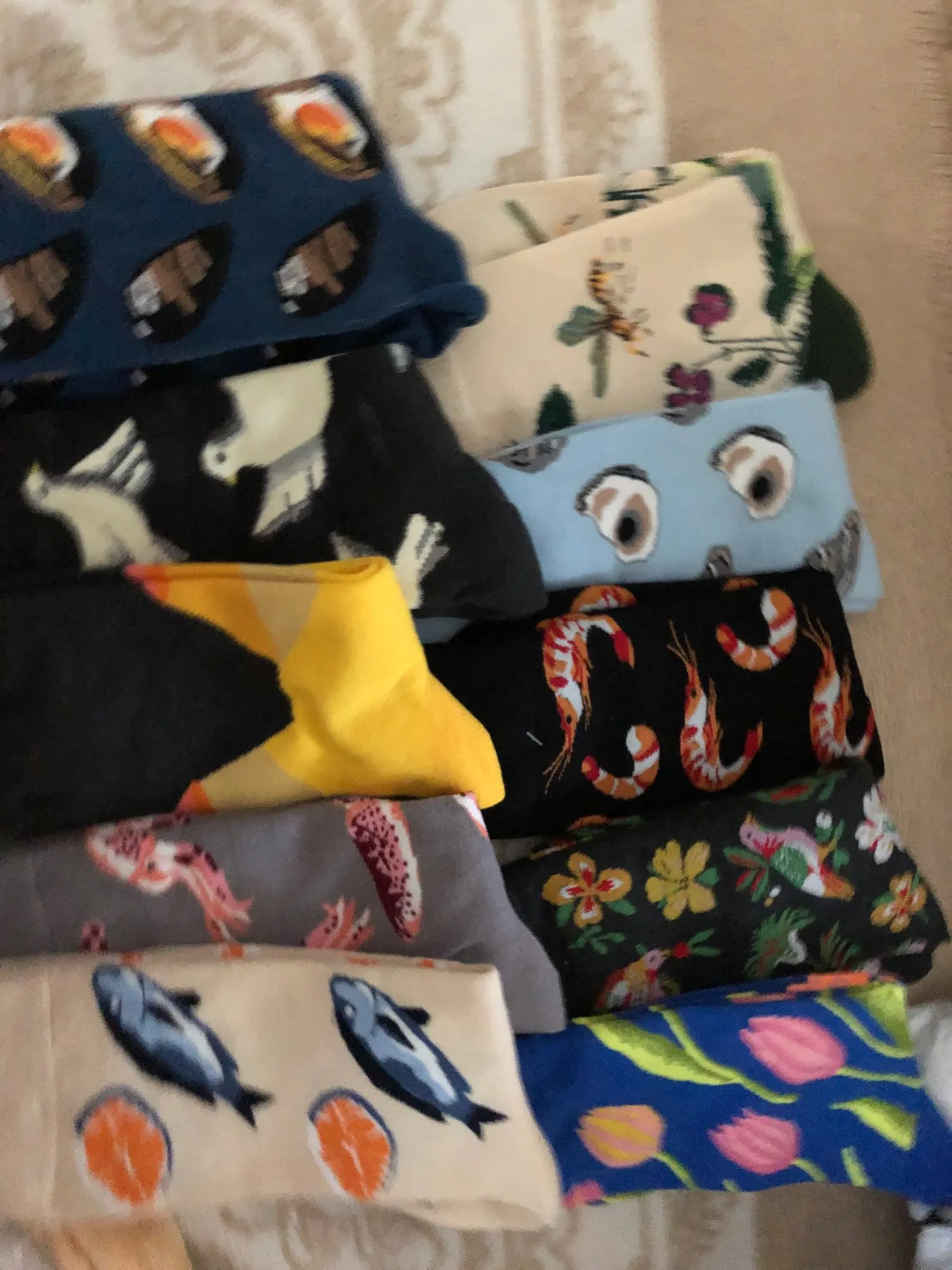 До Москвы дошëл за 10 дней. 4 пары достаточно плотных носков, 5 пара из ткани потоньше. Рисунки яркие