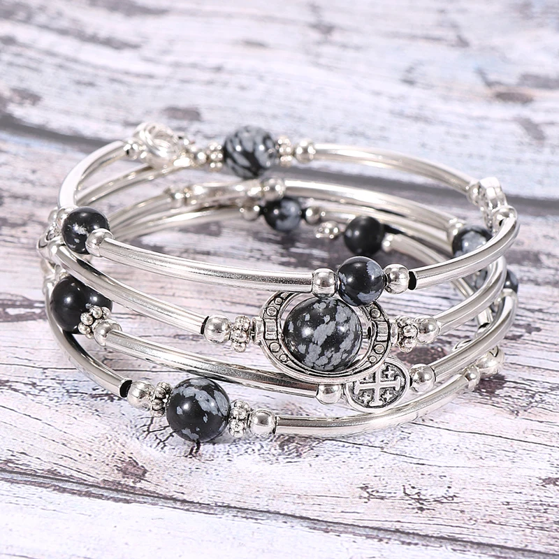 Женский браслет из натурального камня, 4-слойный винтажный браслет в стиле бохо, с медной трубкой, с бусинами из лавового камня, ювелирный женский браслет