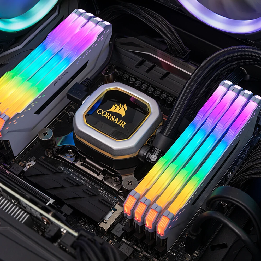 VENGEANCE RGB PRO Series DDR4 разогнутая память загорает ваш компьютер с завораживающим динамическим многозонным RGB освещением, обеспечивая при этом лучшую производительность DDR4.