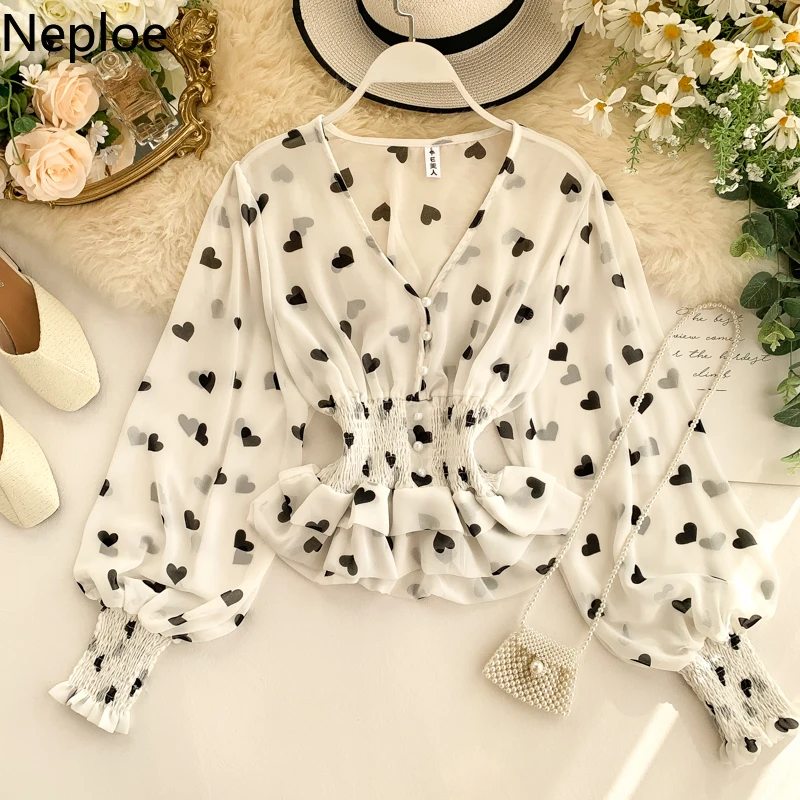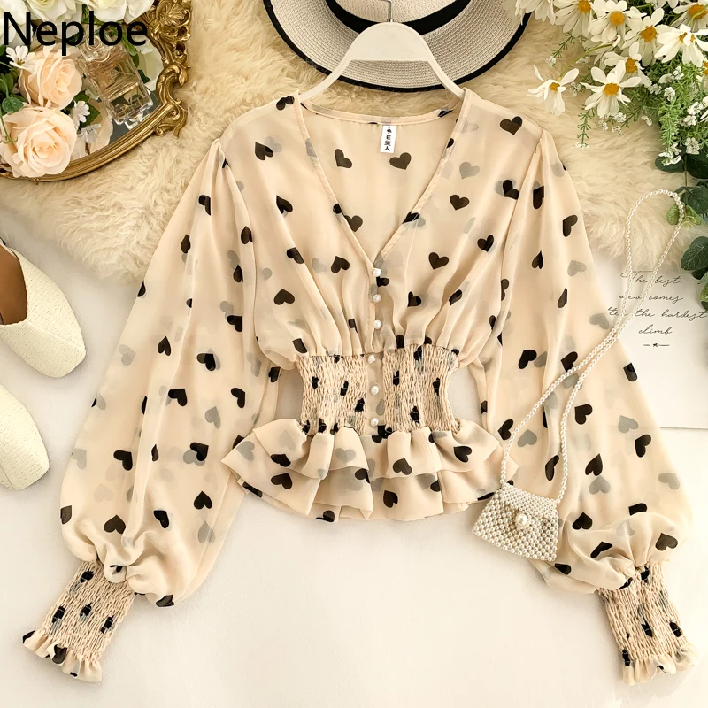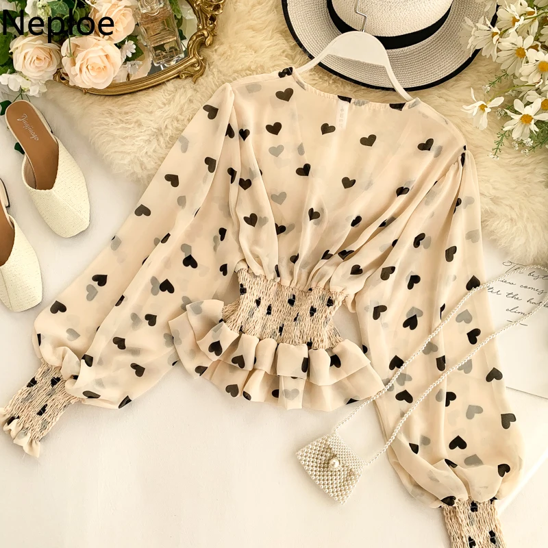 Блузка Neploe с V-образным вырезом, длинными рукавами-фонариками, принтом в виде сердца, женская элегантная плиссированная Праздничная блузка с оборками, новая рубашка на весну