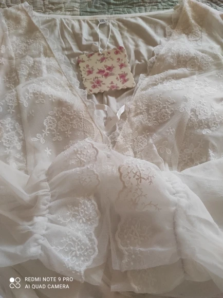 Очень красивая домашняя одежда! Чувствуешь себя принцессой :) единственная проблема с ростом - я 170 см и размер L немного коротковат - поднимаешь руку и грудь сползает наверх.