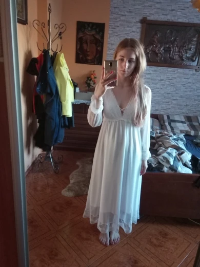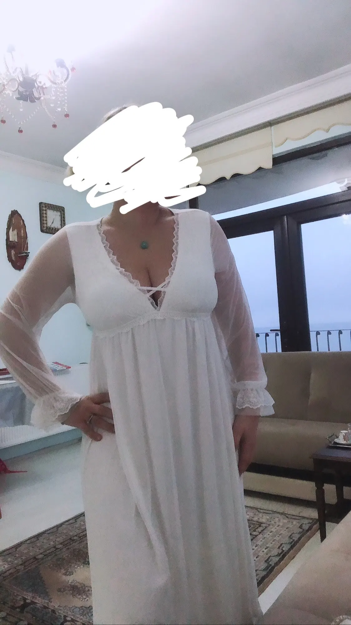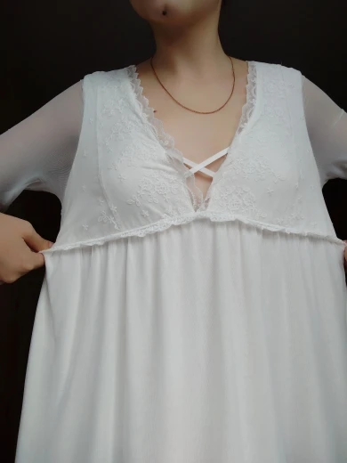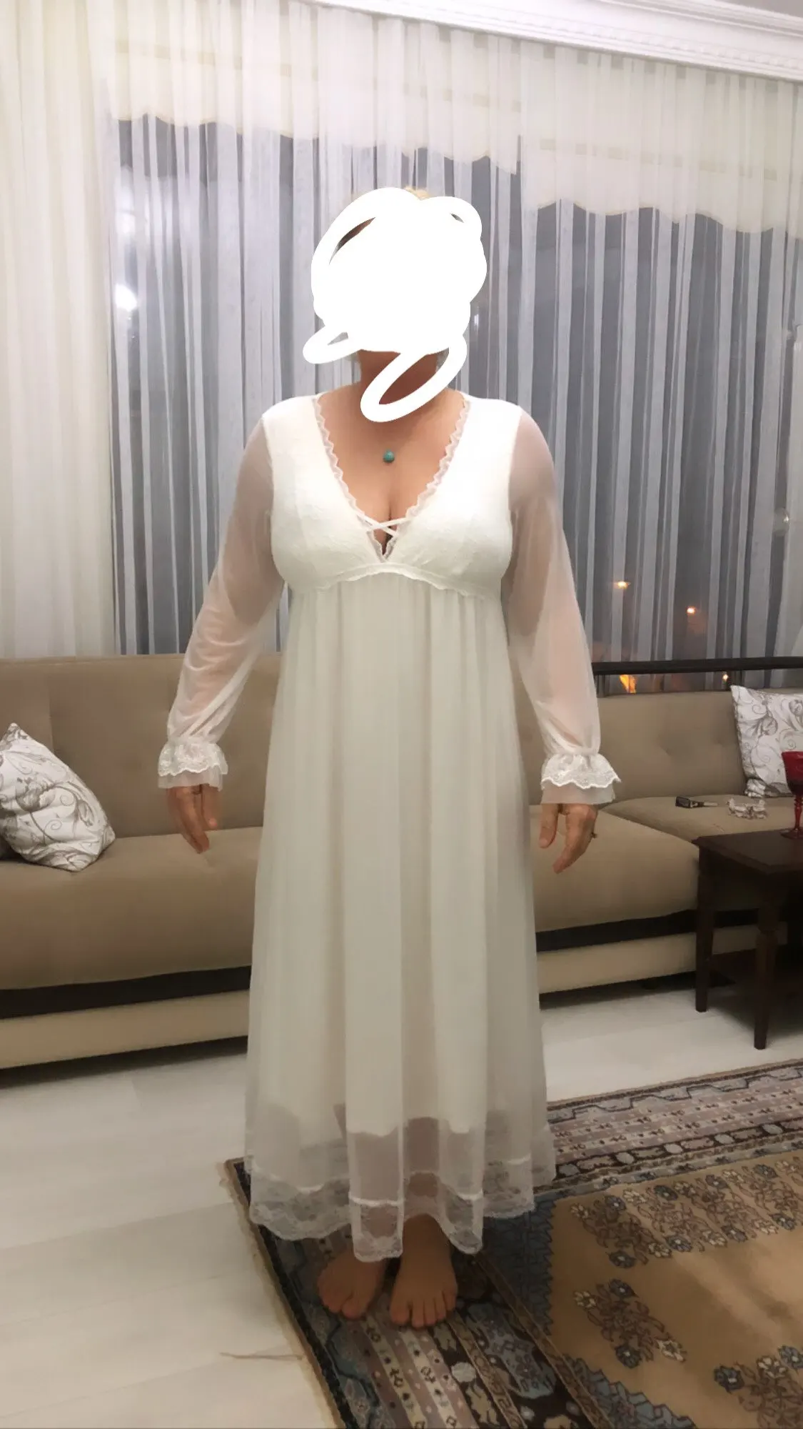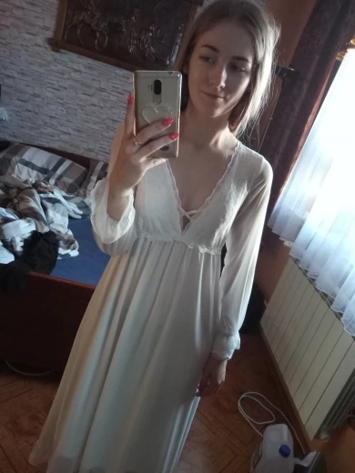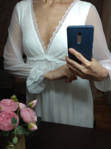 Чудесная ночная рубашка теплого белого цвета. Хорошее качество-не ожидала такого встретить на Али за такие деньги. На рост 176 см грудь только-только вошла по высоте,даже немного приходится ее приподнимать. В целом очень понравилась рубашка:нежная. Рукава немного коротковаты,но для ночной рубашки это непринципиально.