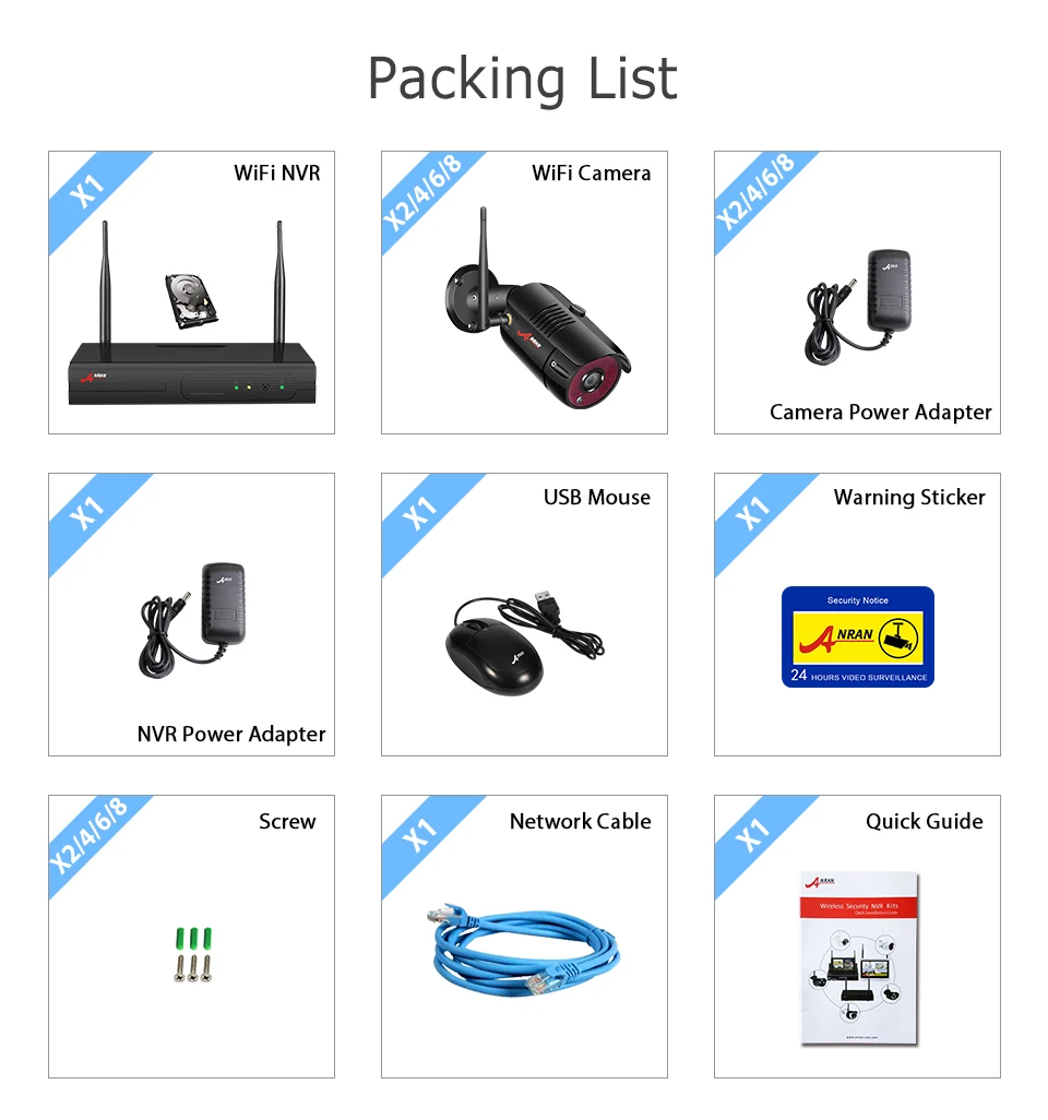 Информация посылка:· 1x 8CH беспроводной сетевой видеорегистратор· 2/4/6/8x цилиндрические камеры (зависит от выбранных вами свойств)· 2/4/6/8x блок питания для камеры· 1x блок питания для NVR· 1 USB-мышь· 1 Предупреждение ющая наклейка (подарок)· Винты 2/4/6/8x· 1x3 фута 1 м Ethernet-кабель· 1x Краткое руководство