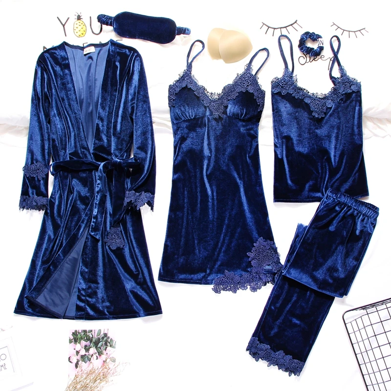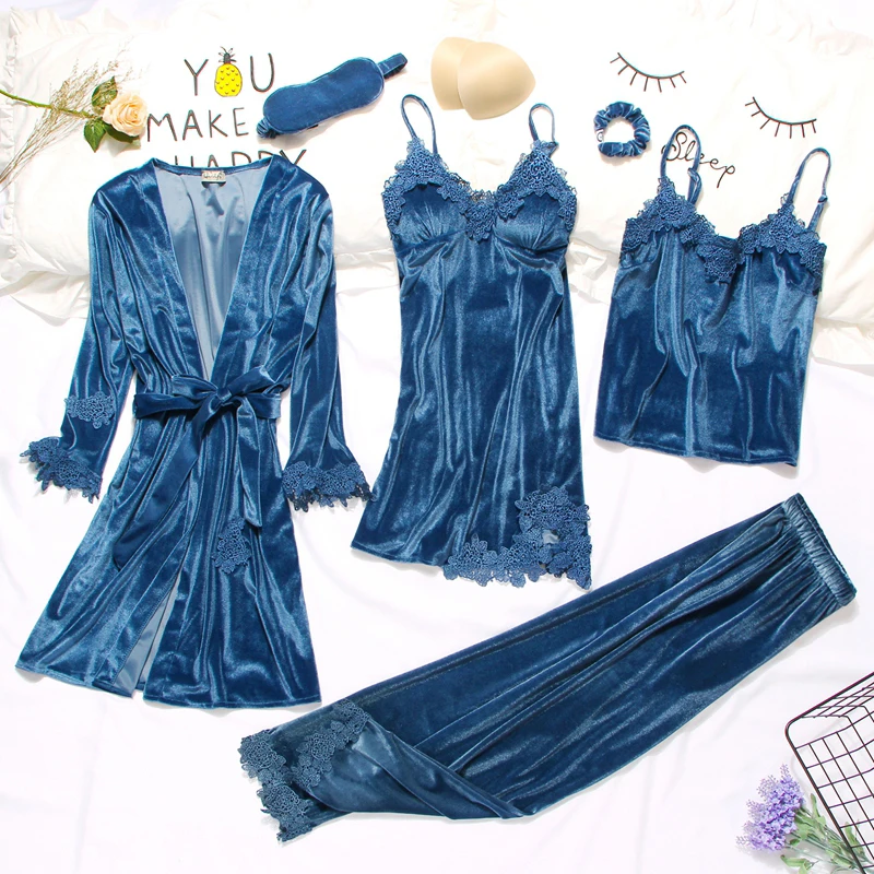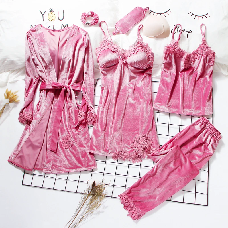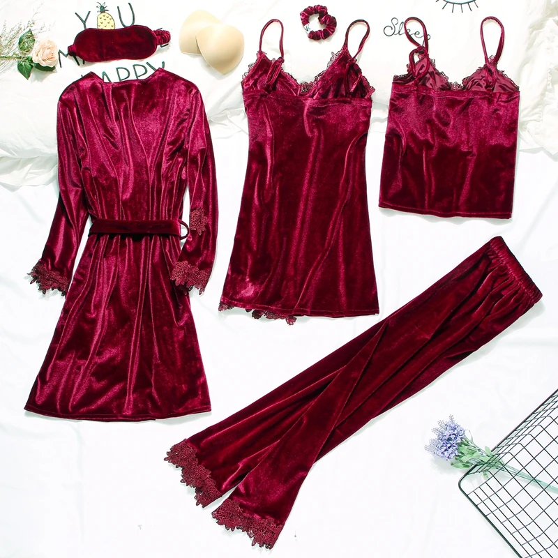 Комплект пижамный Женский, из 6 предметов, с золотистым вельветом, кружевной, без рукавов, на весну, 2020