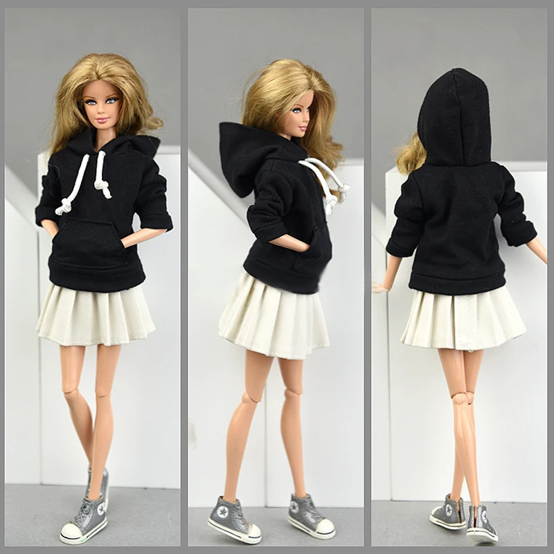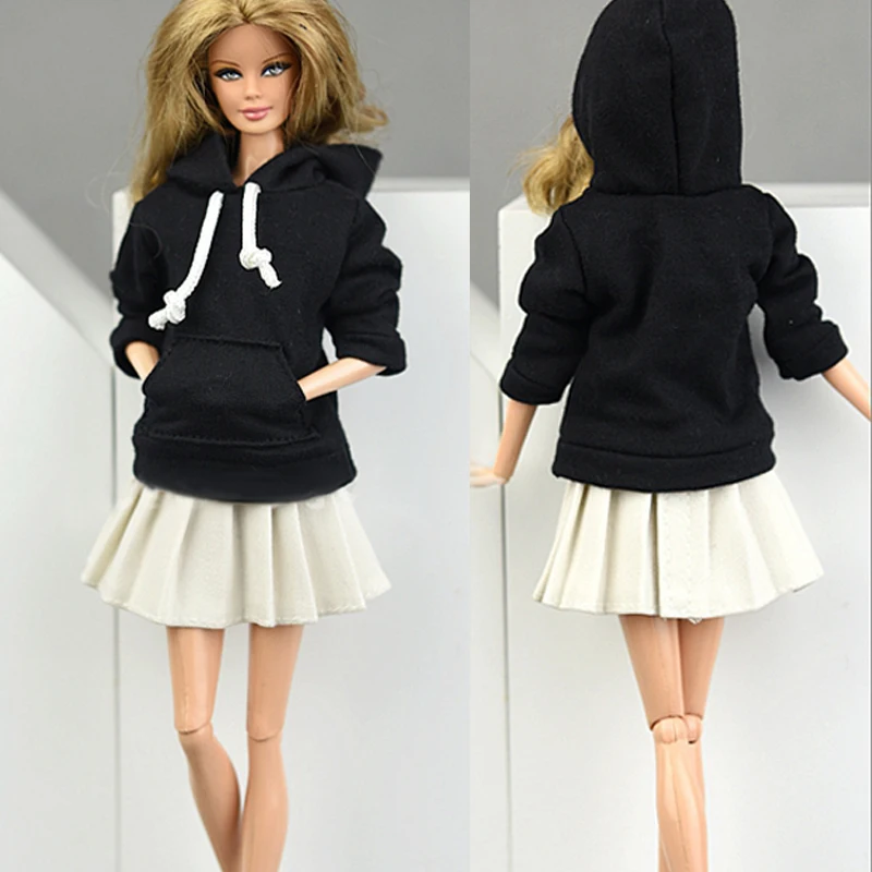 Зимний черный топ с длинными рукавами с капюшоном, короткие юбки, костюм, Одежда для куклы Барби, наряды, одежда для 1/6, BJD, аксессуары для кукол, для детей