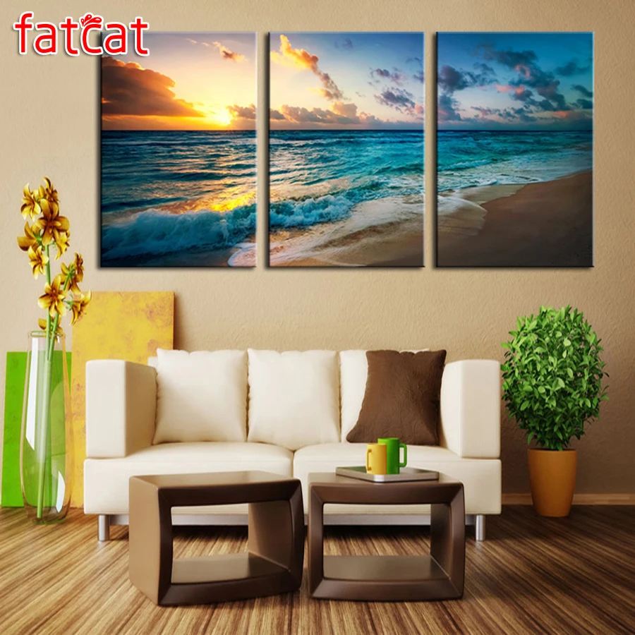 Алмазная 5D картина с закатом FATCAT, картина из натурального морского пейзажа, прямоугольная, круглая, сделай сам, триптих для вышивки, украшение для дома AE401