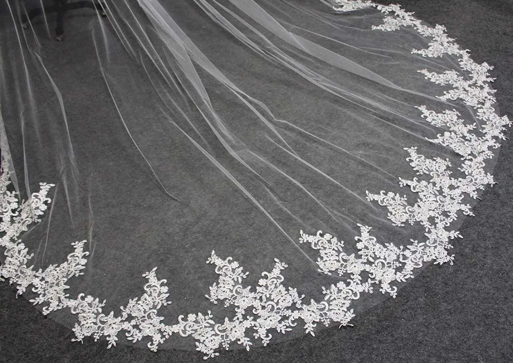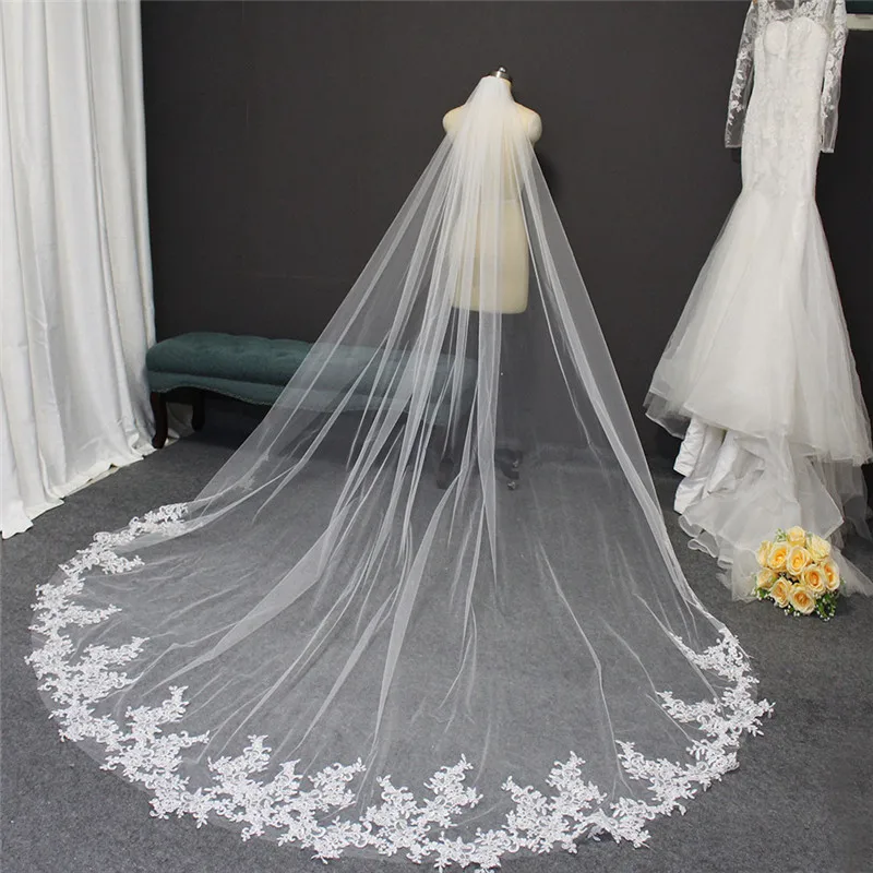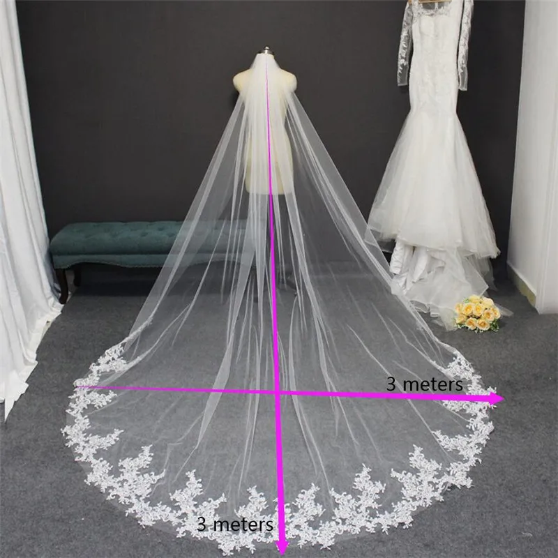 Длинная Кружевная аппликация свадебная вуаль с гребнем 3 метра Соборная Фата для невесты один слой Белая слоновая кость вуаль свадебные аксессуары