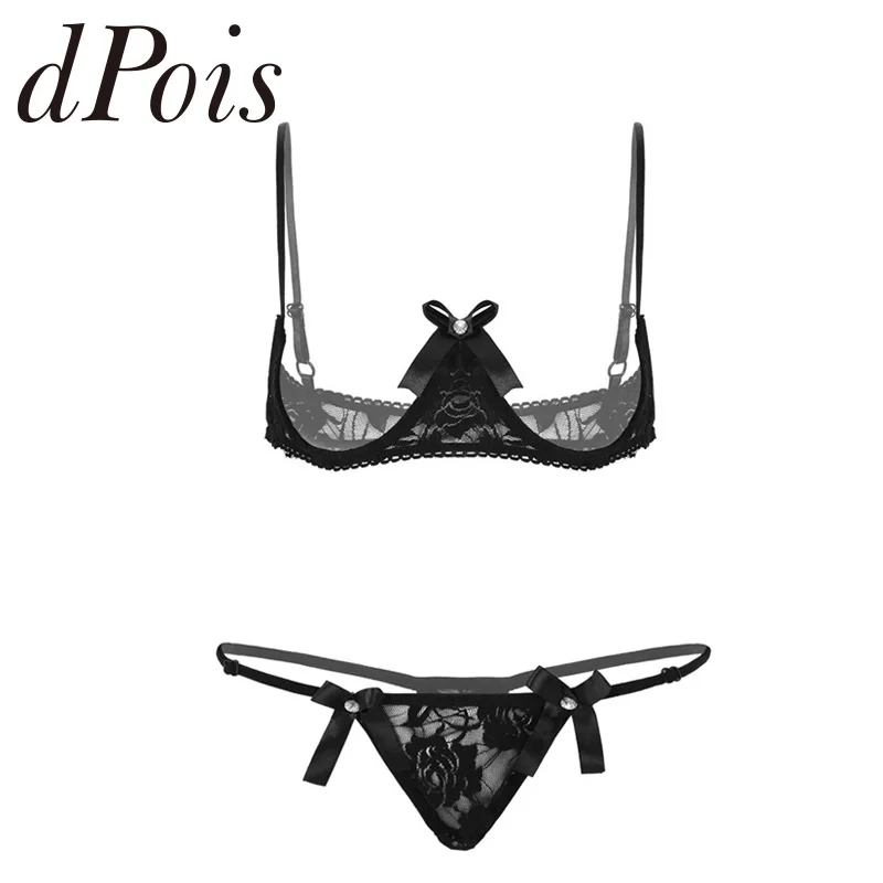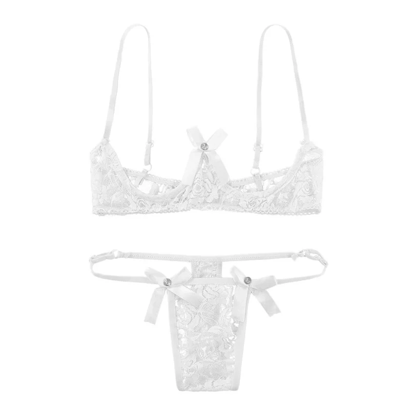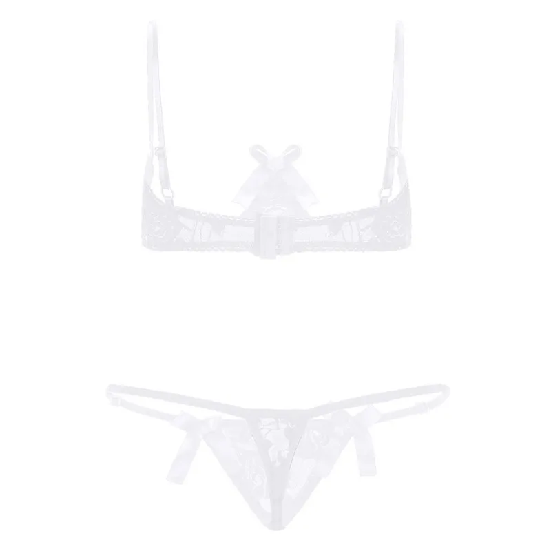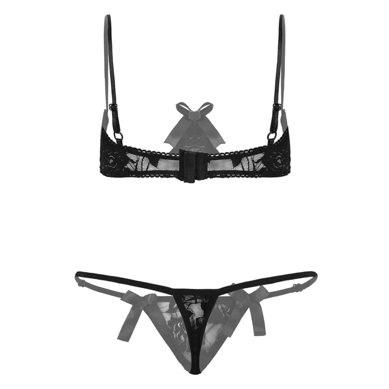 Комплект женского прозрачного кружевного нижнего белья, 2 шт., на тонких бретелях, Открытая грудь, бюстгальтер на косточках + трусики-стринги с низкой посадкой