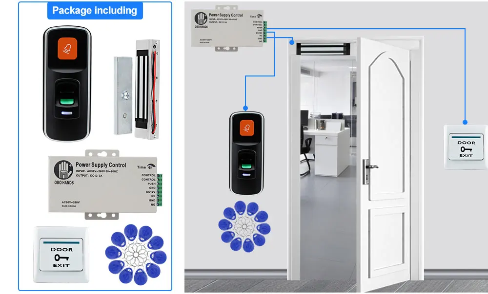 RFID биометрическая система контроля доступа отпечатков пальцев комплект + Электрический магнитныйударБолт замок + кнопка выхода + блок питания + 10 брелков